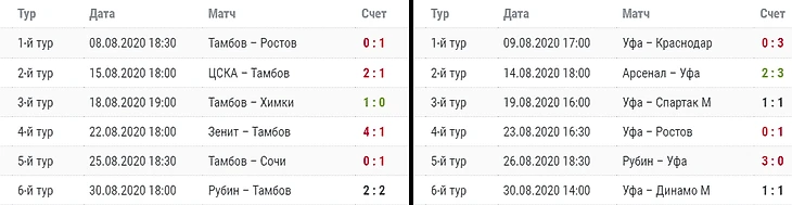 Результаты Тамбова и Уфы после первых 6 туров сезона 20/21.
