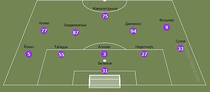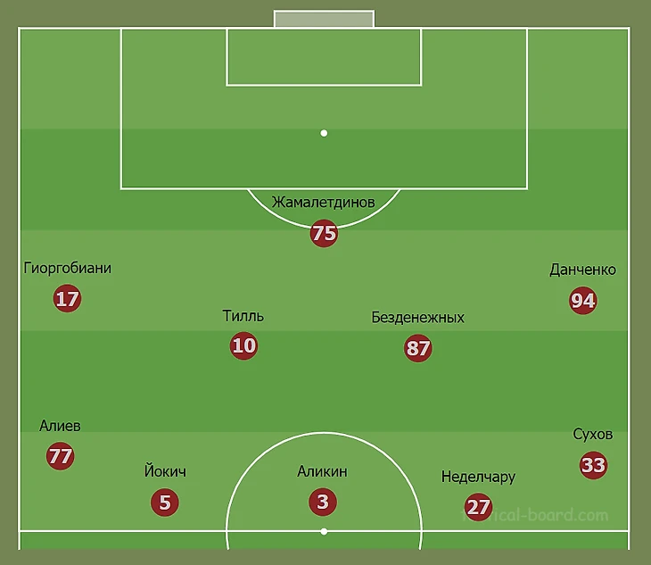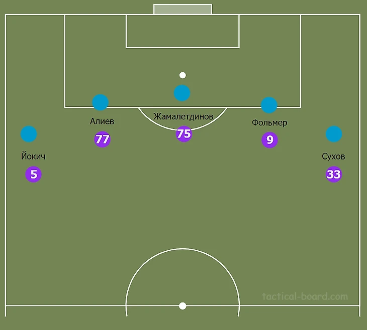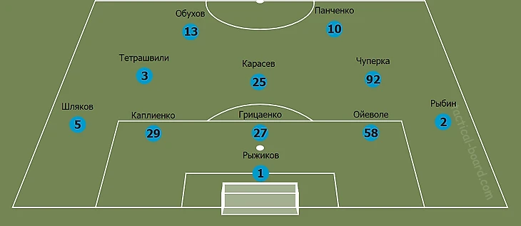 Благодаря широкому расположению защитников (Каплиенко, Грицаенко и Ойеволе) крайние полузащитники башкирской команды должны были «вытягиваться» на фланги, тем самым позволяя создать численное преимущество в середине. Чуперка и Тетрашвили «опускались» в опорную зону для участия в начальной фазе атаки.
