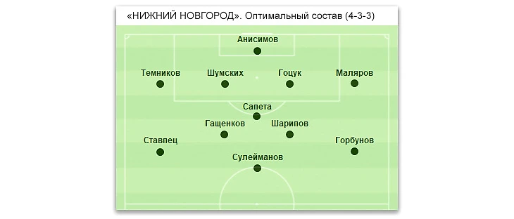 у «Нижнего Новгорода» (4 мяча): 1 мяч – И.Портнягин, М.Палиенко, А.Ставпец, А.Сагитов.