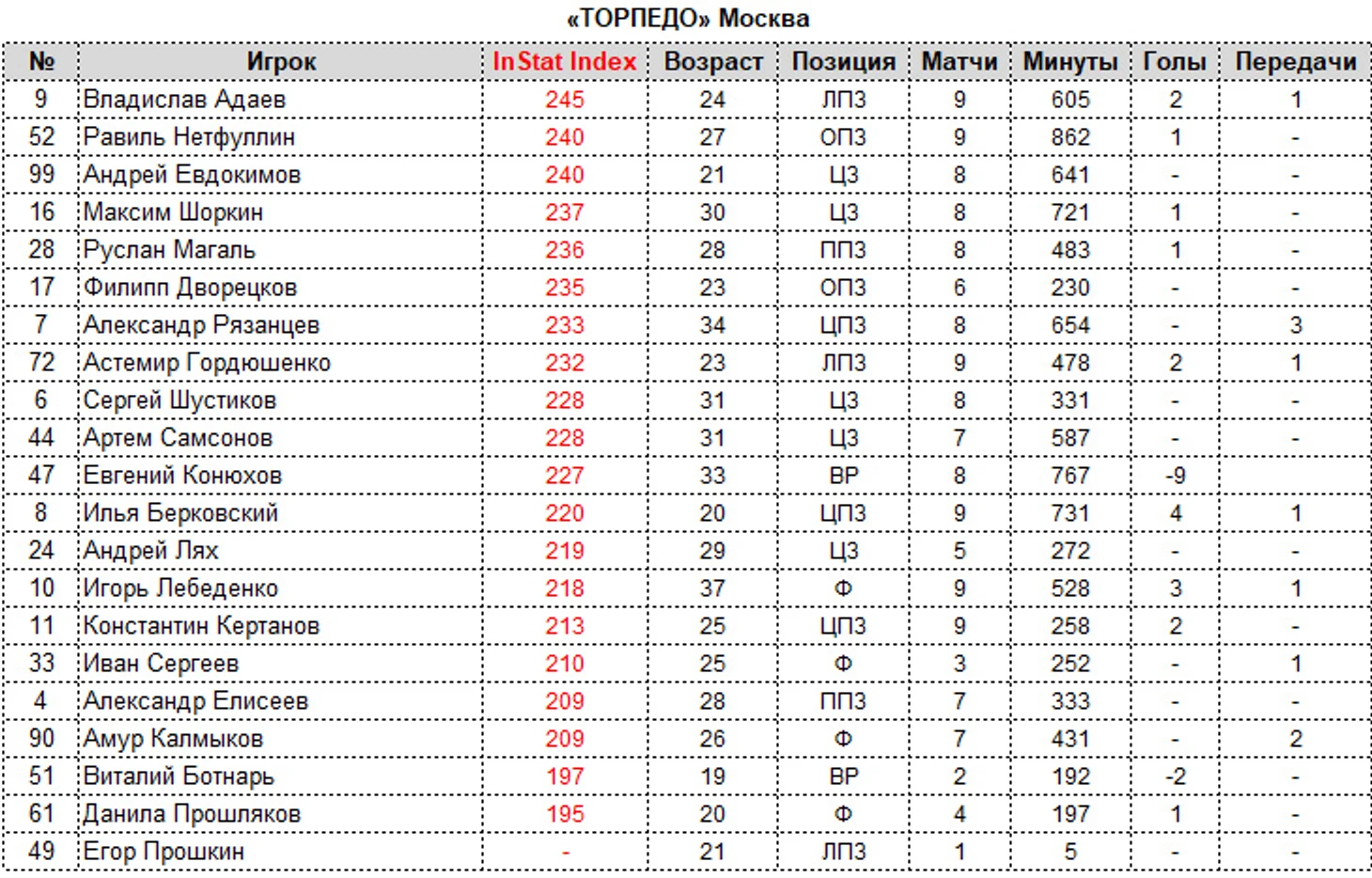Футболисты отсортированы в соответствии с рейтингом спортивного аналитического агентства InStat.