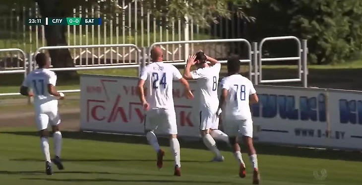 Хавбек «Слуцка» завел руки за голову при праздновании гола. Ранее он высказывался о задержаниях в минском университете