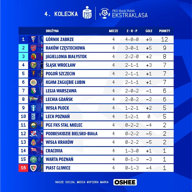 "Подбескидзе" Дмитрия Башлая уступило дома "Ракуву" 1:4. Ченстоховцы забивают как минимум один гол в 15 матчах подряд! "Ракув" на старте сезона оставляет о себе очень приятное впечатление. В "дерби" двух "Висл", сильнее оказались одноклубники из Плоцка (3:0). "Нефтяники" впервые в своей истории сумели одолеть краковчан на выезде с разницей более чем в один гол! "Погонь Щецин" победила "Шлёнск" в родных стенах благодаря пенальти на последних минутах, реализованному вернувшемуся из России Михалу Кухарчику. Полузащитник вроцлавян - Якуб Лабойко на прошлой неделе попрощался с клубом и перебрался в стан "Брешии". Удачи, Куба! 100 матч главного тренера "грифонов" Косты Руняича в Экстраклассе. В понедельничной встрече "Ягеллония" одолела на выезде "Пяст" со счётом 1:0, благодаря голу Хесуса Имаза. Испанец забивает уже в третьем матче подряд. Любопытный факт: если белостачане побеждают в Гливицах, то всегда без пропущенных мячей!