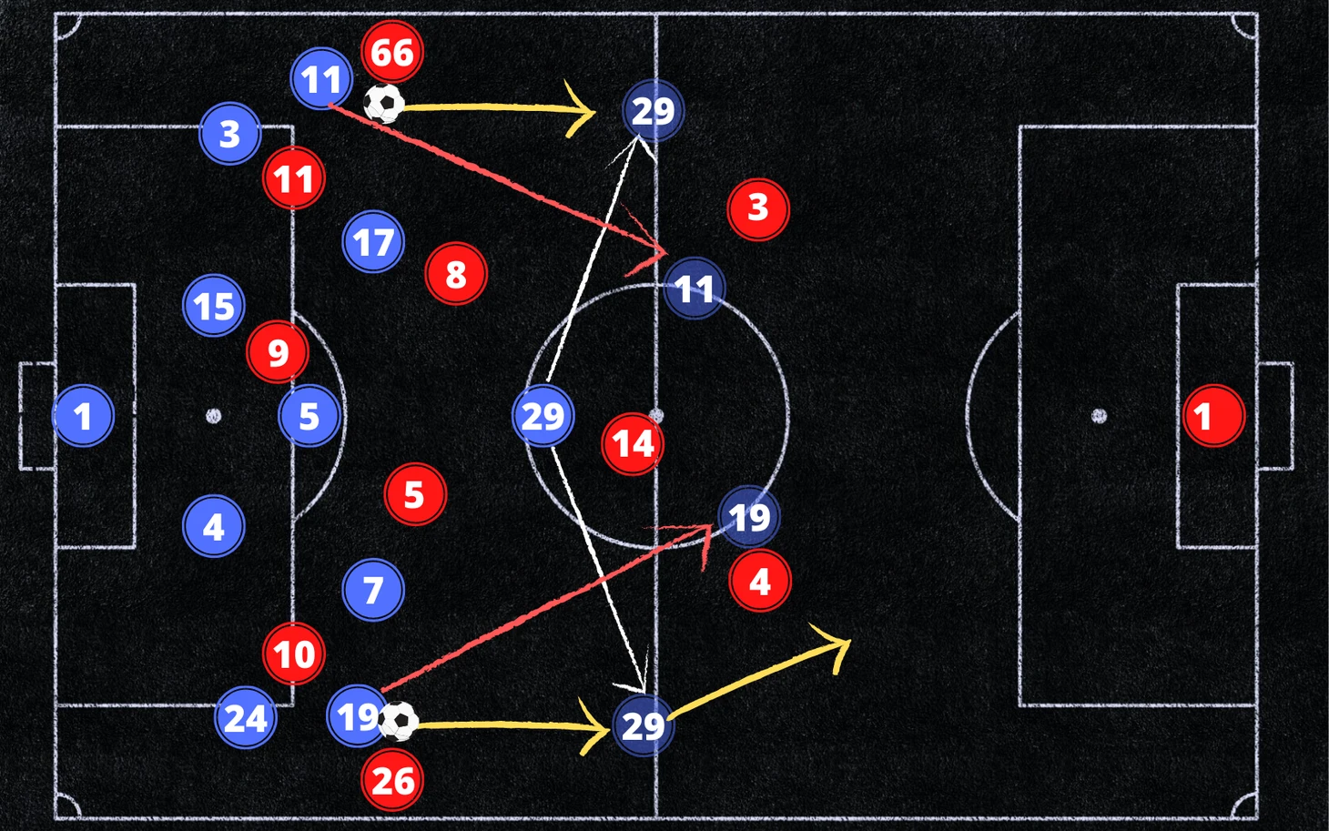 Фрэнк снова сделал ставку на контратакующие действия своей команды, но в этот раз игрокам лучше удавалось выходить на половину поля соперника, используя короткие пасы. Во многом этому содействовало наличие Ковачича на поле, который предпочитает играть низом и способен обеспечить продвижение мяча дриблингом.