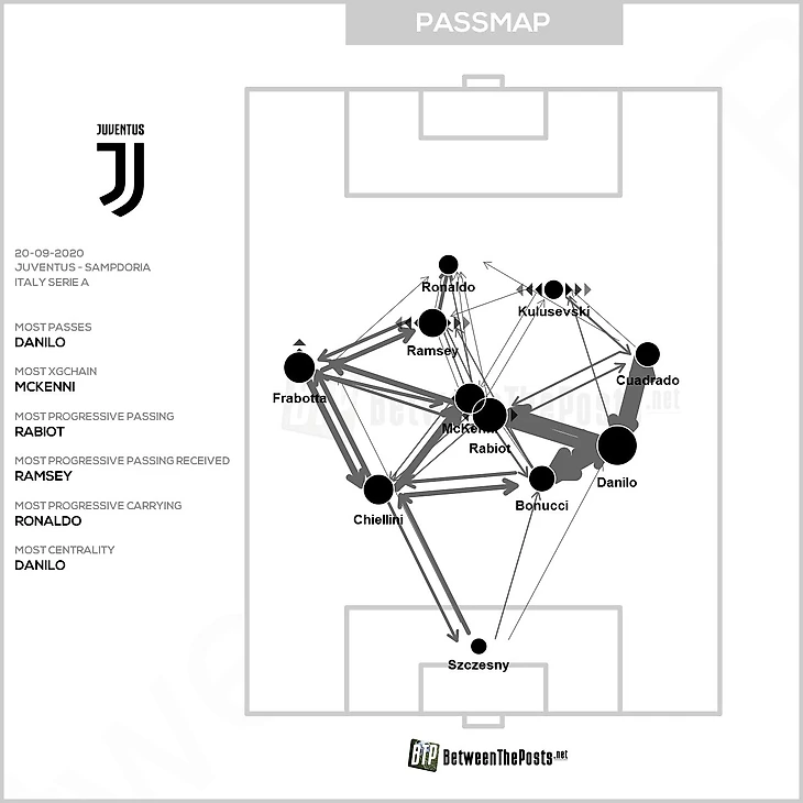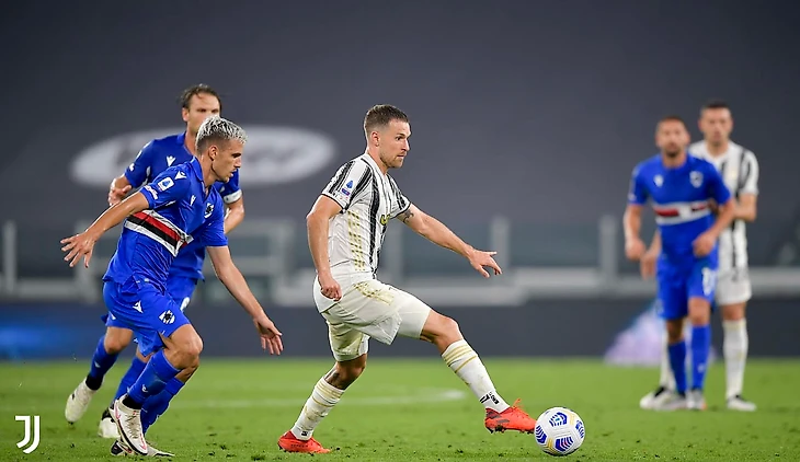 «Ювентус» атакует в схеме – 3-2-5. Трио, сформированное Бонуччи, Кьеллини и Данило, располагалось низко, а Фработта и Куадрадо, постоянно подымались до уровня форвардов, чтобы растянуть оборону «Сампы». В центре поля царили Рабьо и МакКенни закрывая зону перед штрафной.