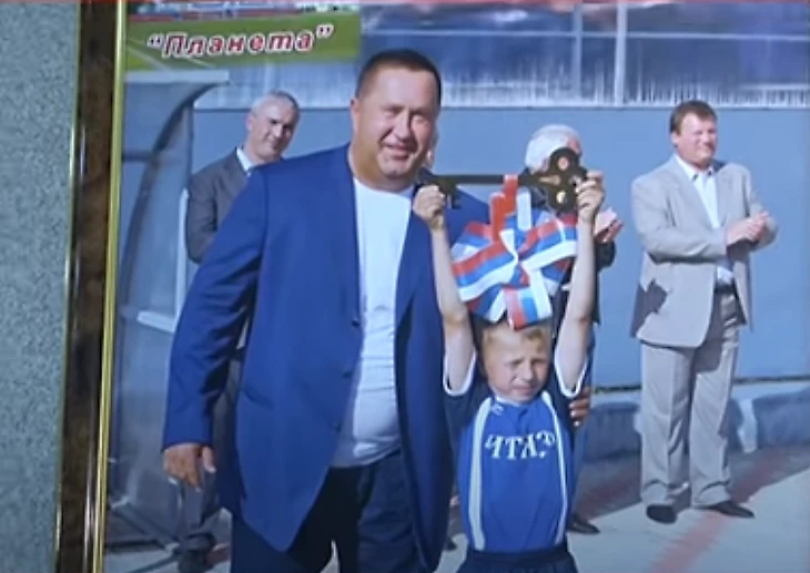 Вот человек, похожий на Андреева, стоит слева за спиной того самого Сергея Лалакина, о котором в контексте истории убийства Тишкова писала «Новая газета». Лалакин открывает стадион в роли председателя благотворительного фонда «Наследие», финансировавшего реконструкцию.