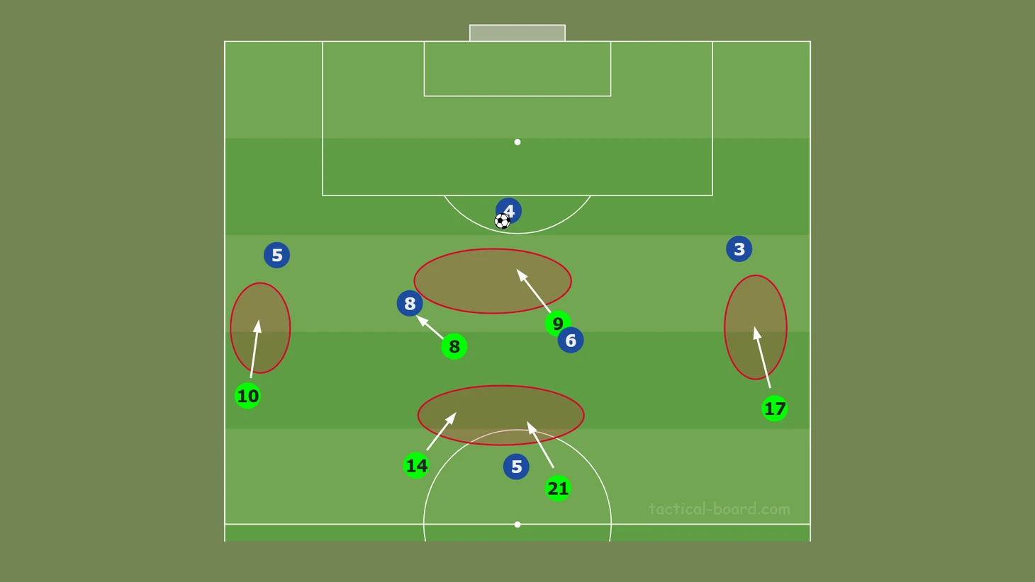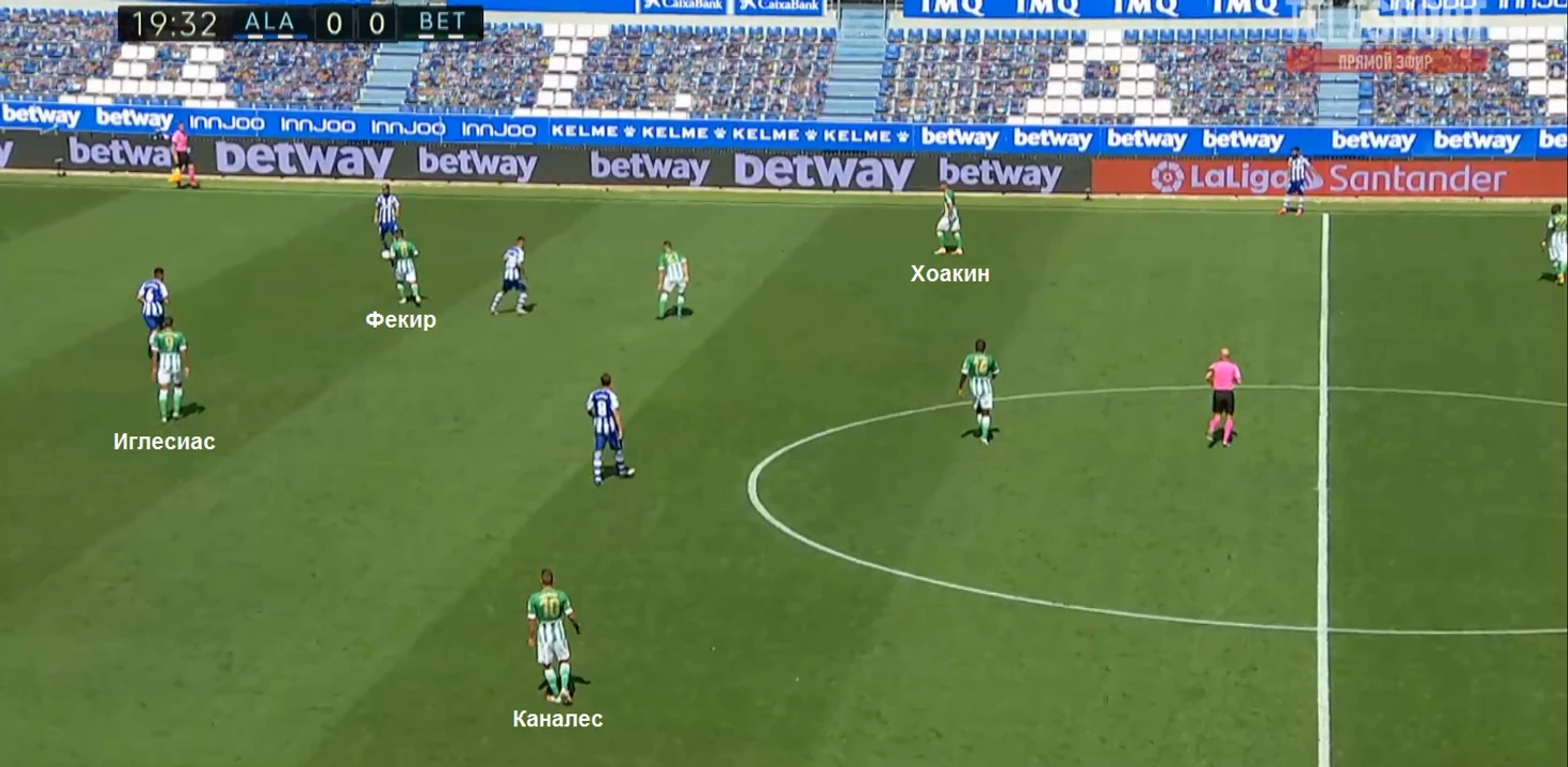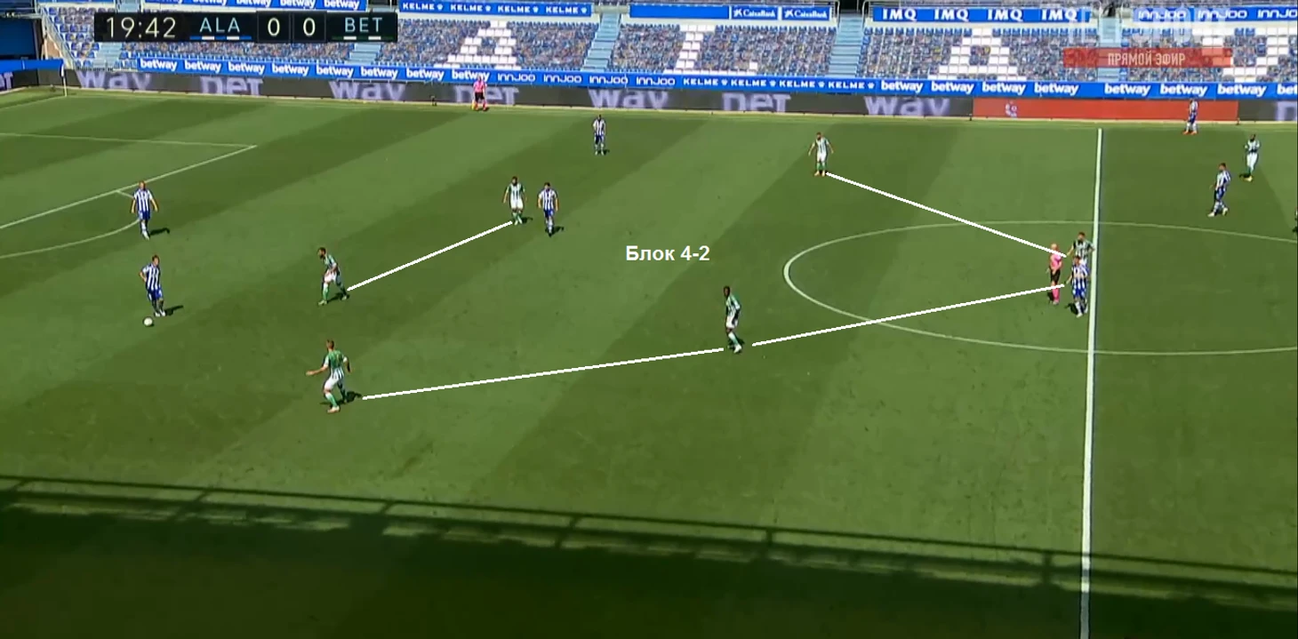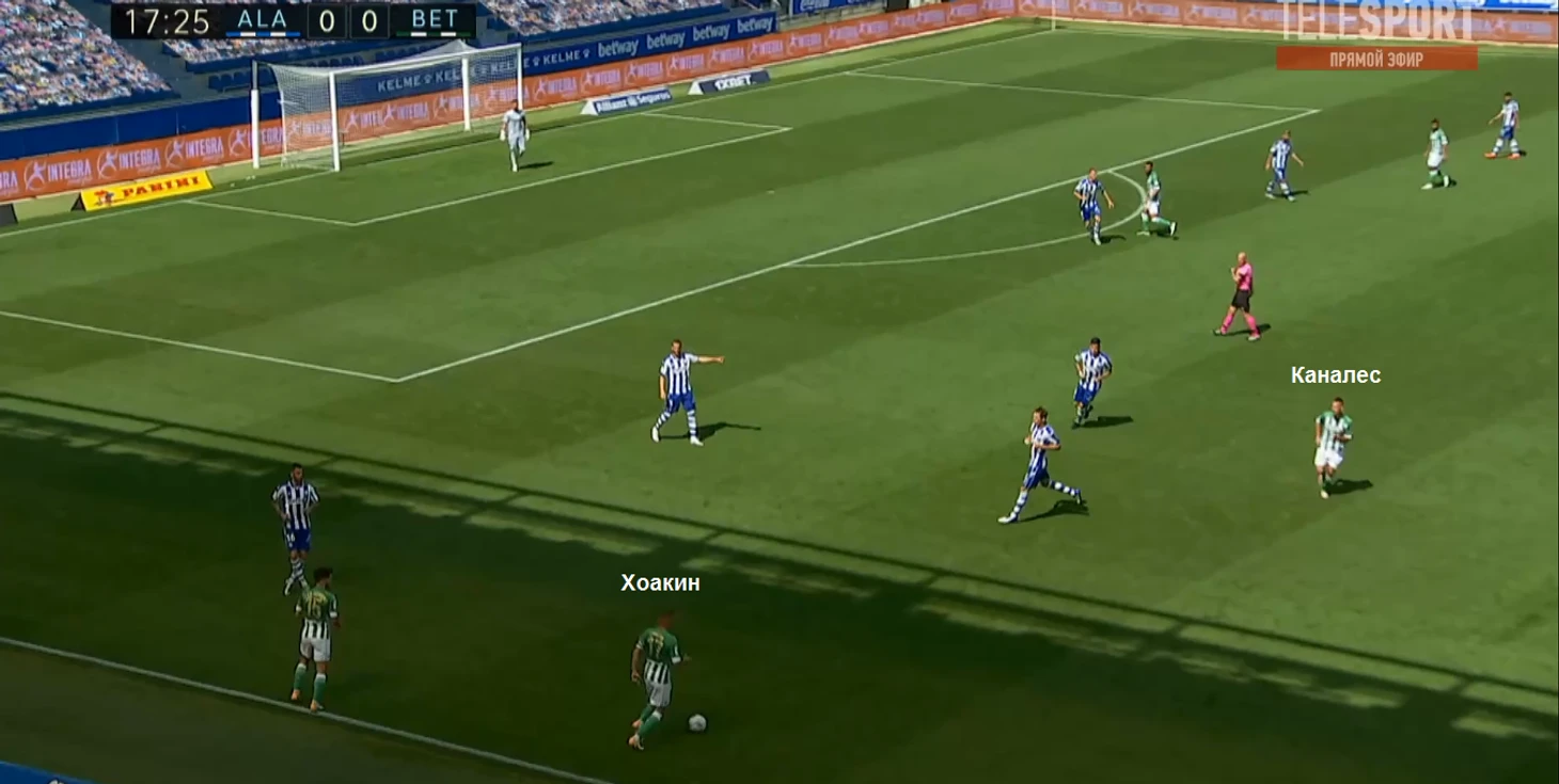 3. В матче с «Алавесом» команда старалась встречать соперника на его половине, однако это не высокий прессинг. Игроки блоком 4-2 располагались на стороне «Алавеса», не оказывая давление, а просто перекрывали зоны для продвижения мяча. Хозяева играли по схеме с тремя центральными защитниками 3-1-4-2, причем опорные полузащитники опускались очень низко, помогая центральным разыгрывать мяч. Чаще всего Хоакин и Борха Иглесиас давили на зону перед защитниками «Алавеса», Фекир и Каналес отвечали за фланги, Карвалью и Родригез закрывали опорную зону. Таким образом, «Бетис» вынуждал соперника выносить мяч вперед длинными передачами и облегчал возврат мяча себе.