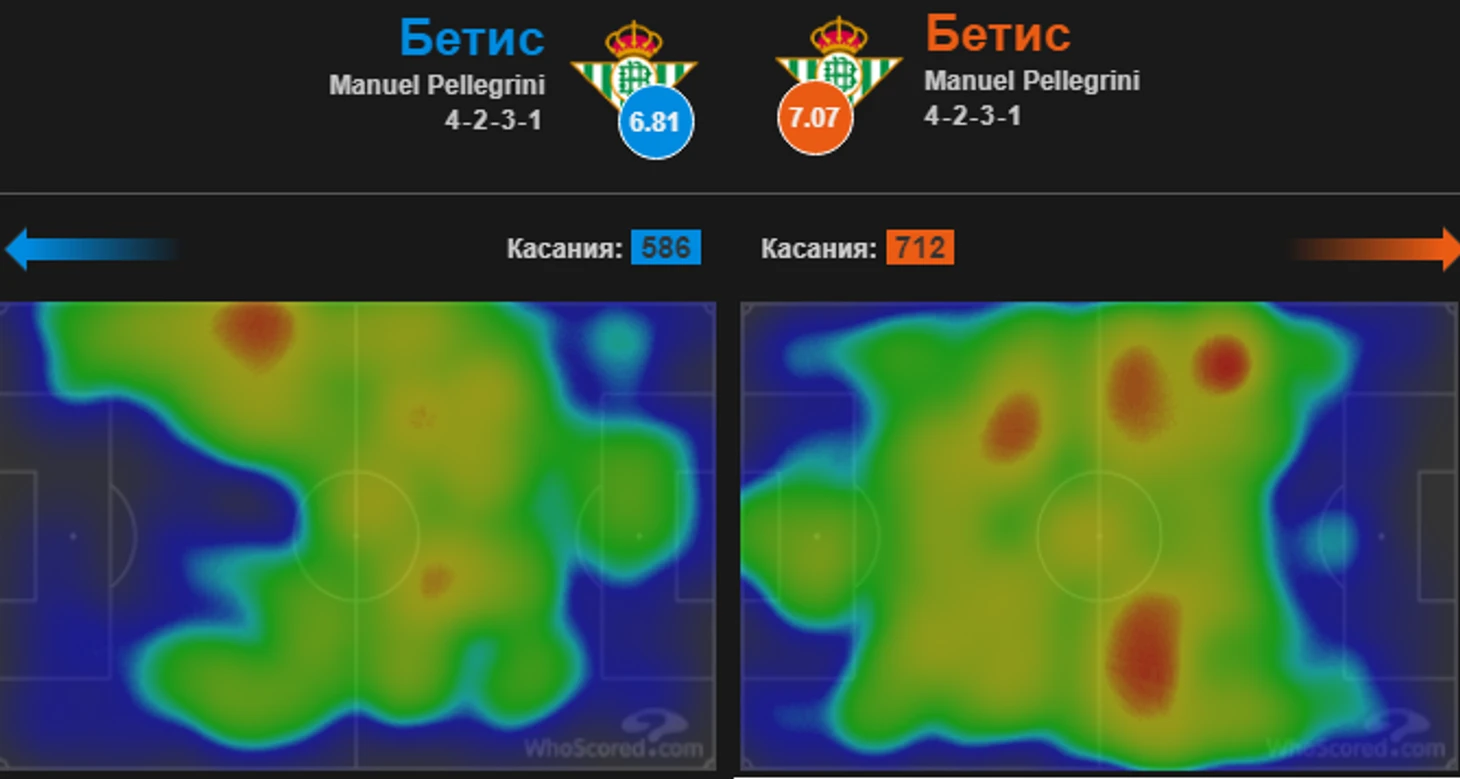 4. Команда Пеллегрини любит владеть мячом. В среднем за два сыгранных тура «Бетис» владел им 59% игрового времени. Играют без ярко-выраженного форварда. Борха Иглесиас хоть и располагается в схеме на острие атаки, однако, очень часто опускается ниже, стараясь стягивать за собой одного из центральных защитников. Таким образом, открывается возможность для забегания в полупространства за спину для Хоакина, Фекира или Каналеса. Это можно заметить по тепловым картам. Особенно в игре с «Алавесом», где видно насколько Иглесиас не был активен в центре атаки.