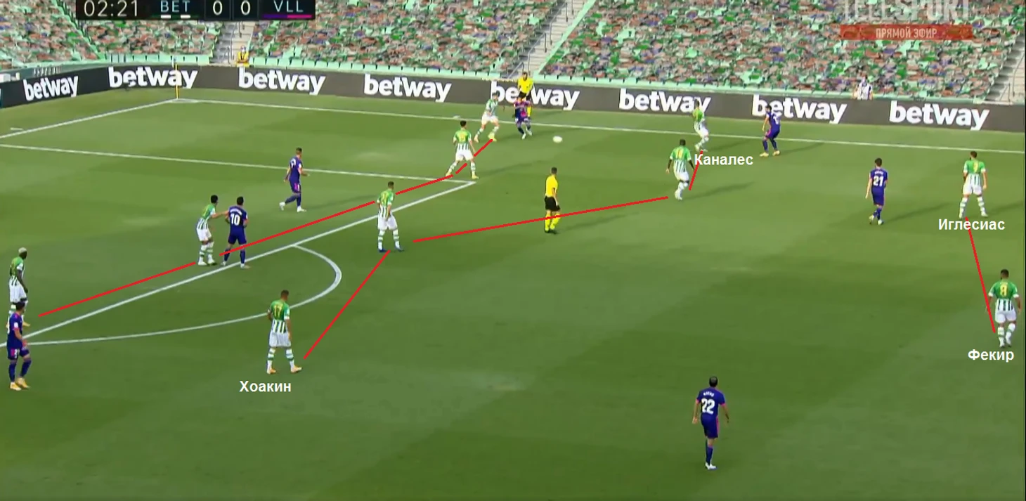5. Тройка Хоакин-Каналес-Фекир не закреплена за своими позициями, и по ходу игры демонстрируют взаимозаменяемость. Иглесиас играет строго в центре атаки. В матче с «Алавесом» Хоакин мог располагаться под нападающим, но часто менялся местами с Каналесом. Либо Фекир также мог оказаться в центре, а вместо него уходил на фланг тот же Хоакин. Пеллегрини допускает взаимозаменяемость игроков на позициях в атаке, и не закрепляет их на определенных местах. Главное, чтобы зоны были всегда закрыты. Плюс такие передвижения игроков лишний раз путают защиту соперника, создавая дисбаланс постоянной сменой позиций.