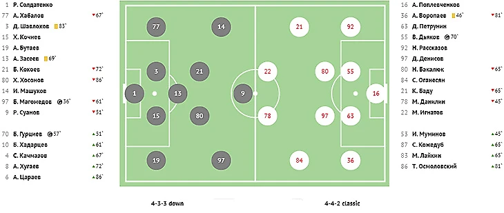 После стартовой 45-минутки «Алания» по делу обыгрывала своего соперника, хотя именно красно-белые имели первый голевой момент, когда Михаил Игнатов не реализовал выход один на один. А вот хозяева в конце концов материализовали территориальное преимущество в гол Бутты Магомедова, который протолкнул мяч в ворота после прострела с правого фланга.