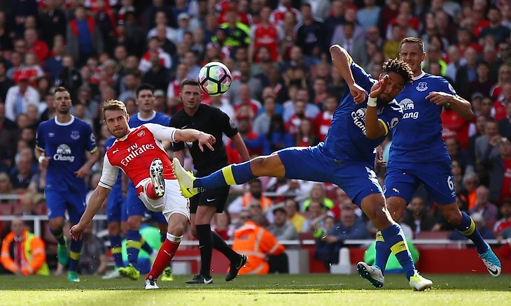 Эмерик ведёт верховую борьбу, но мяч задевает его предплечье