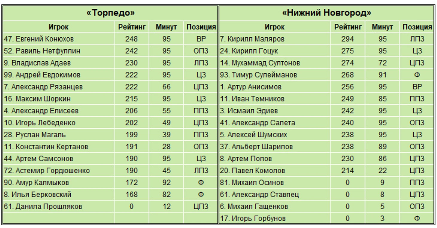 «Торпедо» - «Нижний Новгород»: рейтинг футболистов от спортивного аналитического агентства InStat