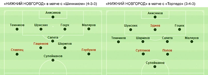 А вот главный тренер гостей Роберт Евдокимов серьёзно перестроил ряды «Нижнего Новгорода». В центре обороны оказались сразу три атлетичных центральных защитника – Алексей Шумских, Исмаил Эдиев, Кирилл Гоцюк. На флангах акцент тоже сменился на разрушительный. Игорь Горбунов и Александр Ставпец отправились на лавку, а вместо них сыграли Иван Темников и Кирилл Маляров – защитники вместо хавбеков с уклоном в атаку. Цемента в опорной зоне добавило введение второго хавбека – её наряду с капитаном команды Александром Сапетой заполнил Альберт Шарипов. Форвард был один – Тимур Сулейманов. Из глубины его поддерживали Мухаммад Султонов и Артём Попов. Стало ясно, что любящий отдать мяч и играть вторым номером «Нижний Новгород» ещё больше позаботился о крепости задней линии, а впереди рассчитывал на длинные передачи в адрес Сулейманова. Формально схему гостей расписывали как 3-4-3, по факту же это была 5-2-2-1.