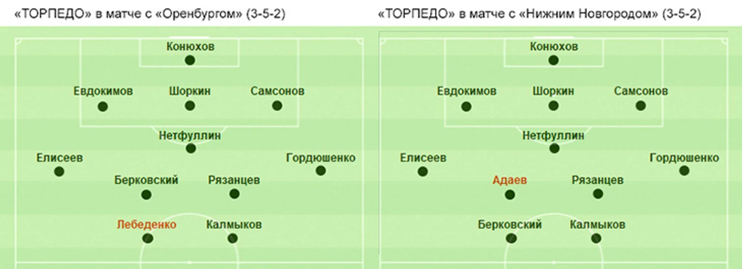 - В перерыве Сергей Игнашевич перестроил схему команды, выпустив вместо Астемира Гордюшенко Игоря Лебеденко. По сути, она отзеркалила схему нижегородцев. Амур Калмыков остался впереди, под ним расположились вышедший на замену Лебеденко и опустившийся чуть глубже Илья Берковский, Александр Рязанцев отошёл в опорную зону в пару к Равилю Нетфуллину, а Владислав Адаев ушёл на привычный левый фланг. Но опробовать новую расстановку «Торпедо» не успело, поскольку сразу пропустило. Последовала подача Кирилла Малярова из глубины поля с левого фланга в штрафную торпедовцев, сброс назад грудью от Тимура Сулейманова, и набежавший Мухаммад Султонов, которого почему-то никто не держал, сильно пробил метров с 17-ти. Мяч влетел в сетку впритирку с боковой стойкой.