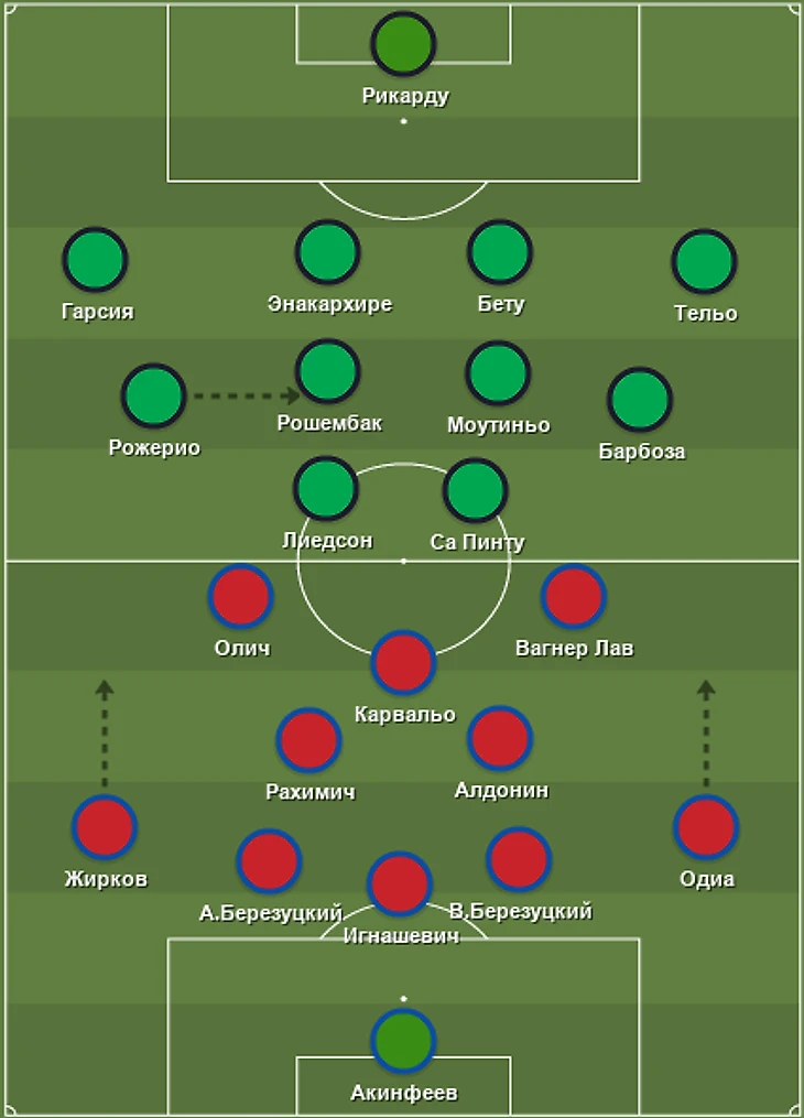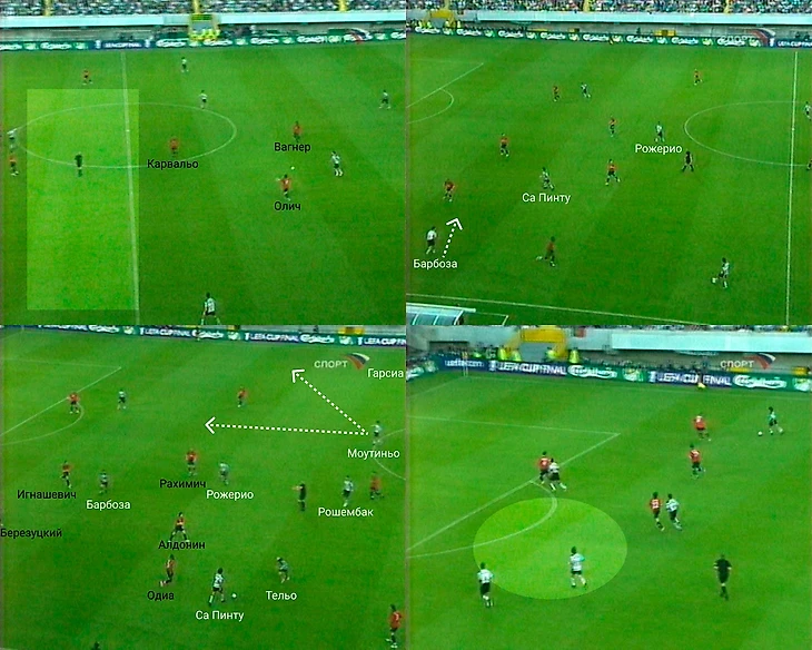 Одна из причин успешного создания зон – относительно пустующая вертикаль опорников. Проблемы создавались из-за того, что Жирков и Одиа располагались неоправданно низко. В такой ситуации фланговый защитник и вингер могли получить мяч без сопротивления, либо отыгравшись между собой, а Рахимичу или Алдонину приходилось опускаться слишком глубоко (на их позицию поднимался Са Пинту), чтобы помочь партнёрам. Ключевой момент – в таких эпизодах португальцы владели мячом и разыгрывали комбинации.