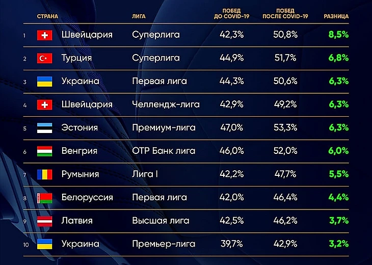 Сильнее всего в положительную сторону картина для хозяев изменилась в чемпионате Швейцарии — плюс 8,5% побед для хозяев. Дальше, на удивление, идет Турция, в которой фанаты самые громкие в Европе (если не в мире) — плюс 6,8% домашних побед. На третьей позиции вторая по силе лига Украины — плюс 6,3%.