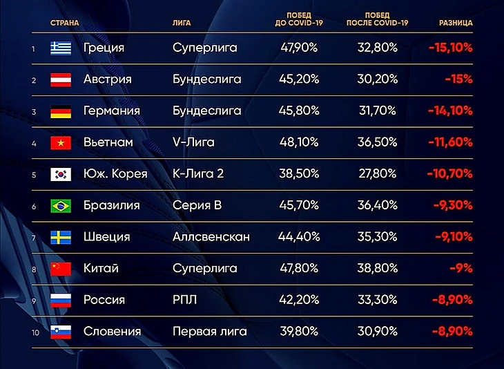 Примечательно, что Россия попала в топ-10 стран с самой большой разницей домашних побед в обычное время и после возвращения футбола с самоизоляции. Наш чемпионат оказался на девятой строчке, показав падение результатов домашних команд на 8,9% — с 42,2% домашних побед до 33,3%.