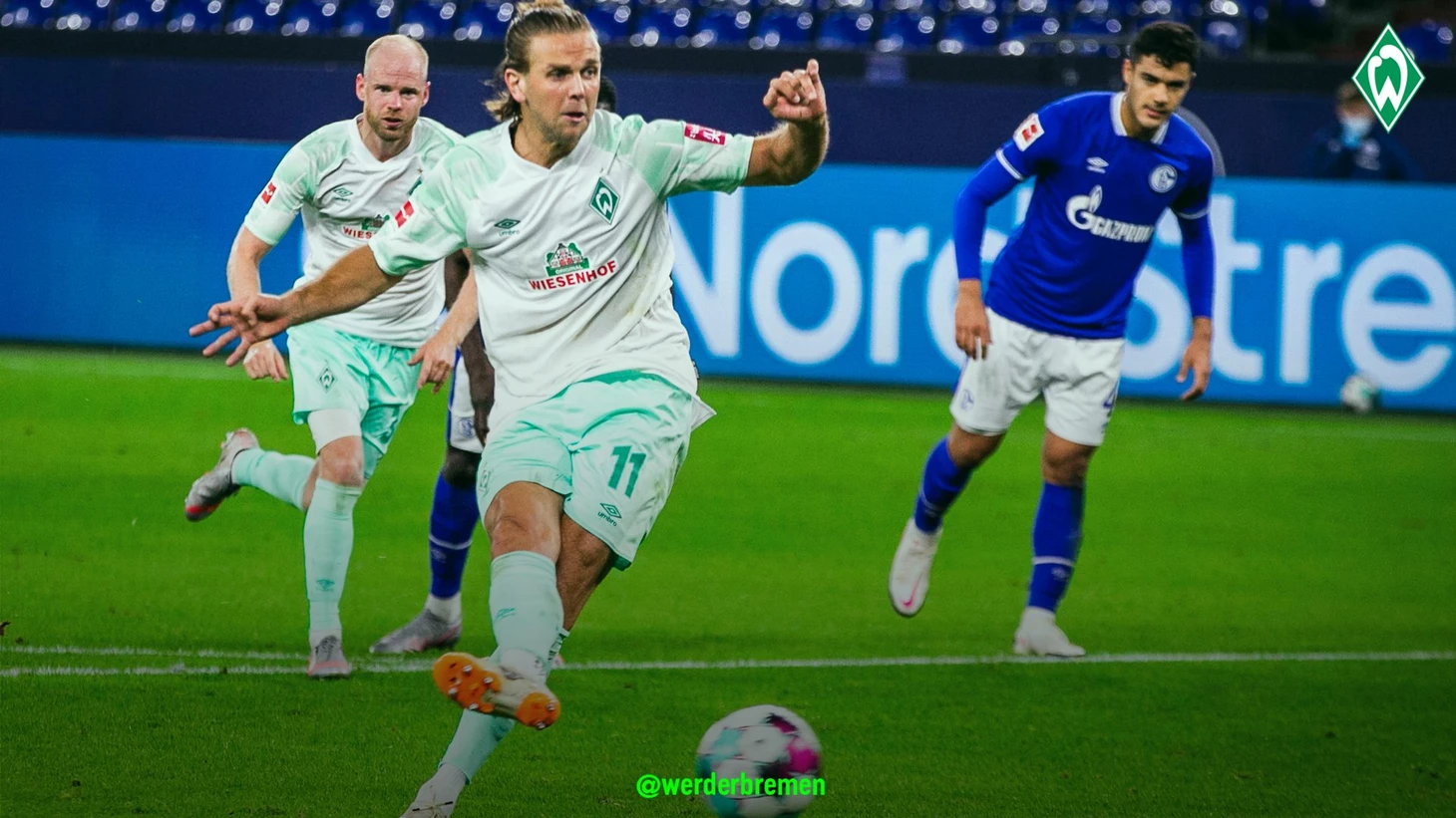 Вторая половина матча началась с неожиданного шанса «Шальке». Ибишевич, заменивший Рамана, оказался один на один с Павленкой, но упустил стопроцентную возможность забить головой после кросса Пасиенсии. Бремен на несколько минут потерял нить матча, и Бужеляб чуть не наказал их за это. Потеряв концентрацию всего на пару минут, «Вердер» вполне мог упустить своё преимущество в два мяча. К счастью, бременцы быстро проснулись. Уже через пять минут Кабак сбил Фюллькруга в своей штрафной и забрал наконец свою желтую карточку. Никлас решил сам пробить пенальти и сделал свой первый хет-трик за «Вердер».