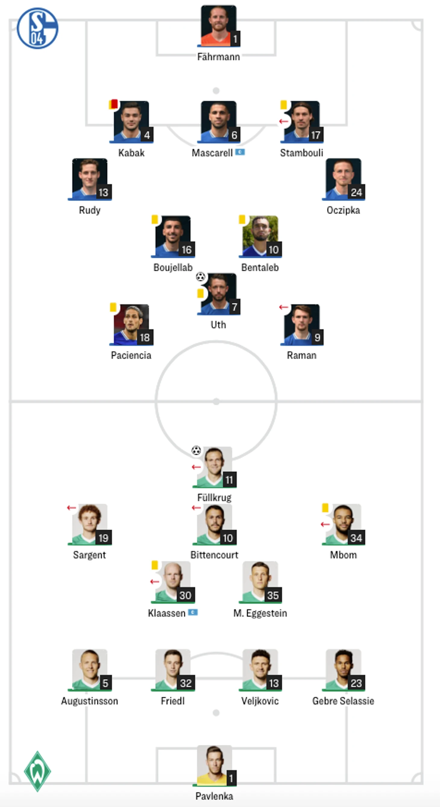 С самого начала матча не было ощущения, что игроки «Шальке» хотят бороться за своего тренера или хотя бы за результат. Если мяч попадал к игрокам из Гельзенкирхена, они просто безыдейно перекатывали его на своей половине. В итоге, несмотря на показатель более 60% во владении мячом, во всём первом тайме они наиграли от силы на два момента: Рамана в самом начале и Пасиенсии в середине тайма. В защите часто образовывались огромные дыры, приглашавшие «Вердер» атаковать.