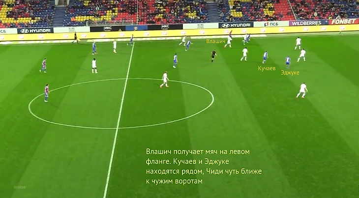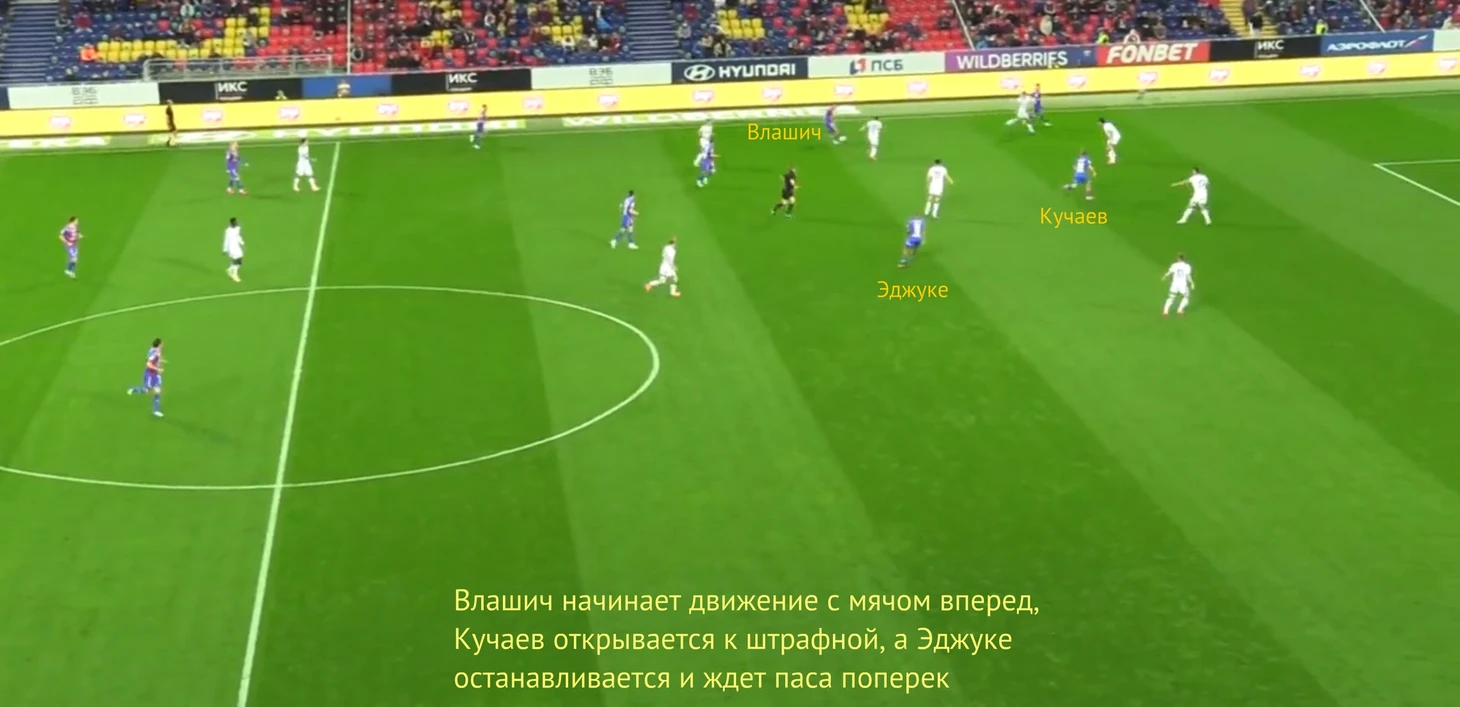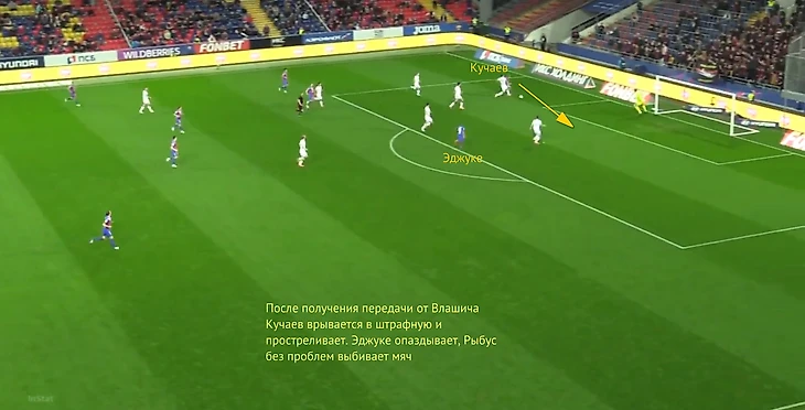 Когда в центре атаки номинально располагается Эджуке (еще раз: помним, что он далеко менее жестко привязан к позиции, чем Чалов, хотя и Федор может уходить в другие зоны, а также о контексте матчей), остроты меньше. В первом тайме с ЦСКА Эджуке вообще не бил и сделал всего 3 касания в чужой штрафной – 2 из них были попытками обводок.