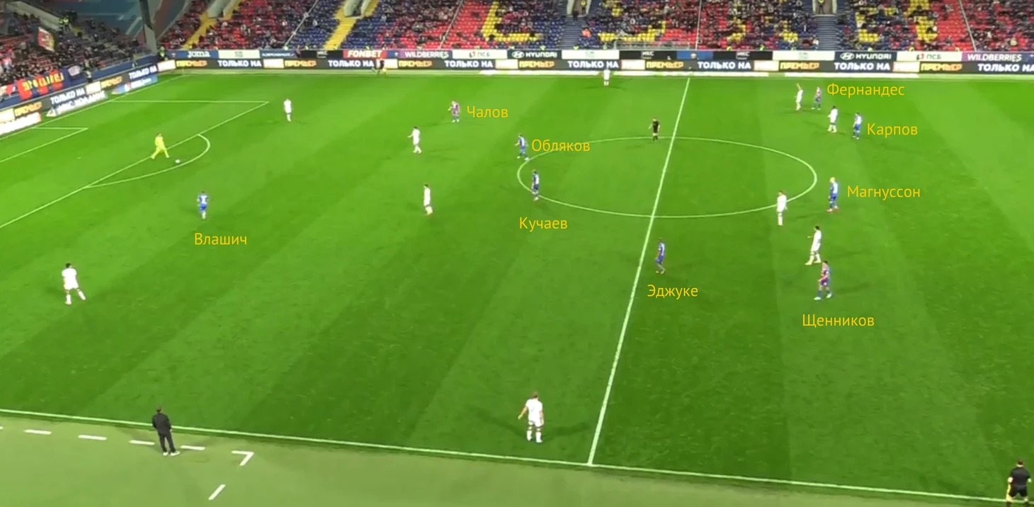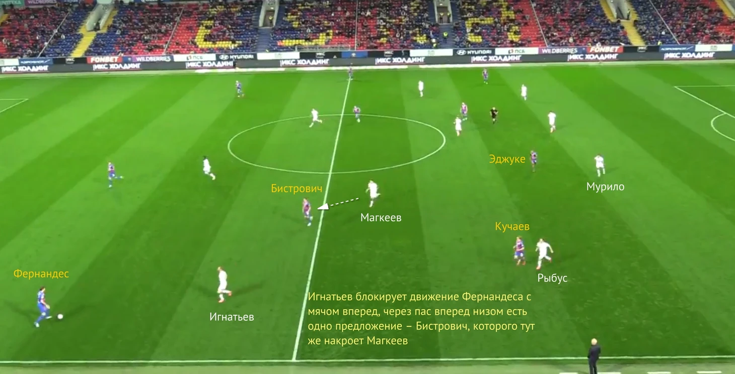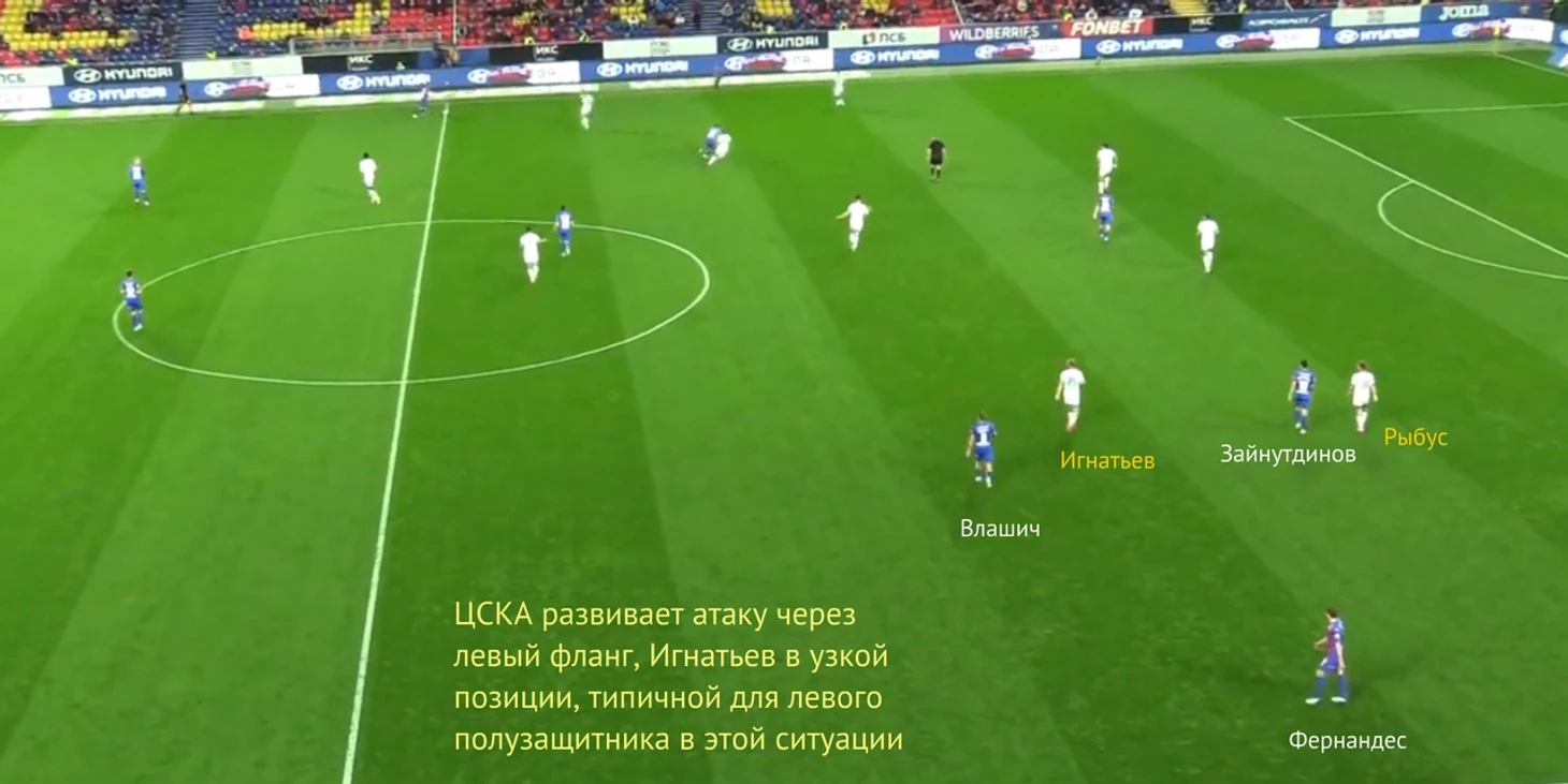 При позиционных атаках ЦСКА через левый фланг Игнатьев сужал пространство, а при диагоналях на Фернандеса (их было немного) к Марио часто выдвигался Рыбус. То есть, да, Николич выпустил Игнатьева налево как игрока, который сыграет при обороне лучше номинальных фланговых полузащитников, но никакой персональной опеки Фернандеса не было.