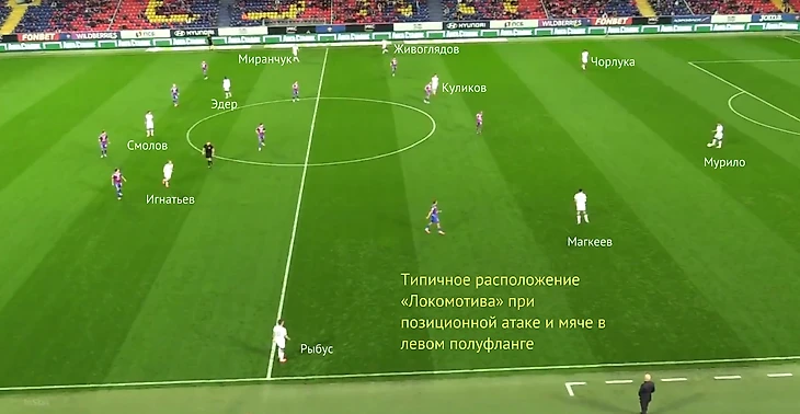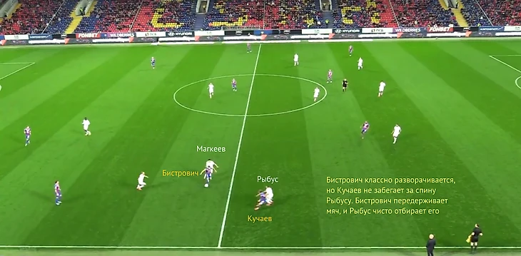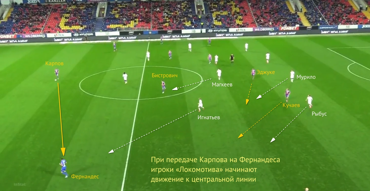 Правда, даже в эти минуты мы иногда видели давление «Локомотива» в среднем блоке – чаще всего оно случалось, когда ЦСКА в позиционной атаке переводил мяч слева либо к Карпову в широкую позицию, либо на Марио Фернандеса. Здесь очень важны были роли Игнатьева (встречал Фернандеса), Магкеева (поджимал Бистровича), Рыбуса (играл по Кучаеву) и Мурило (оказывался ближним центральным защитником к мячу, в его зону приходили Влашич или Эджуке, при этом можно было получить и заброс за спину – как и Рыбусу).