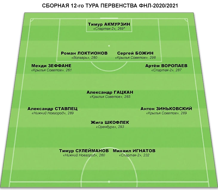Предлагаем Вашему вниманию сборную 12-го тура первенства ФНЛ, выбранную отнюдь не по принципу болельщицких или журналистских симпатий. В её основе – данные аналитического спортивного агентства InStat, просчитывающего ТТД игроков и выводящего на его основе рейтинг, учитывающий работу игрока с мячом, его позицию на поле и вклад в успех команды.