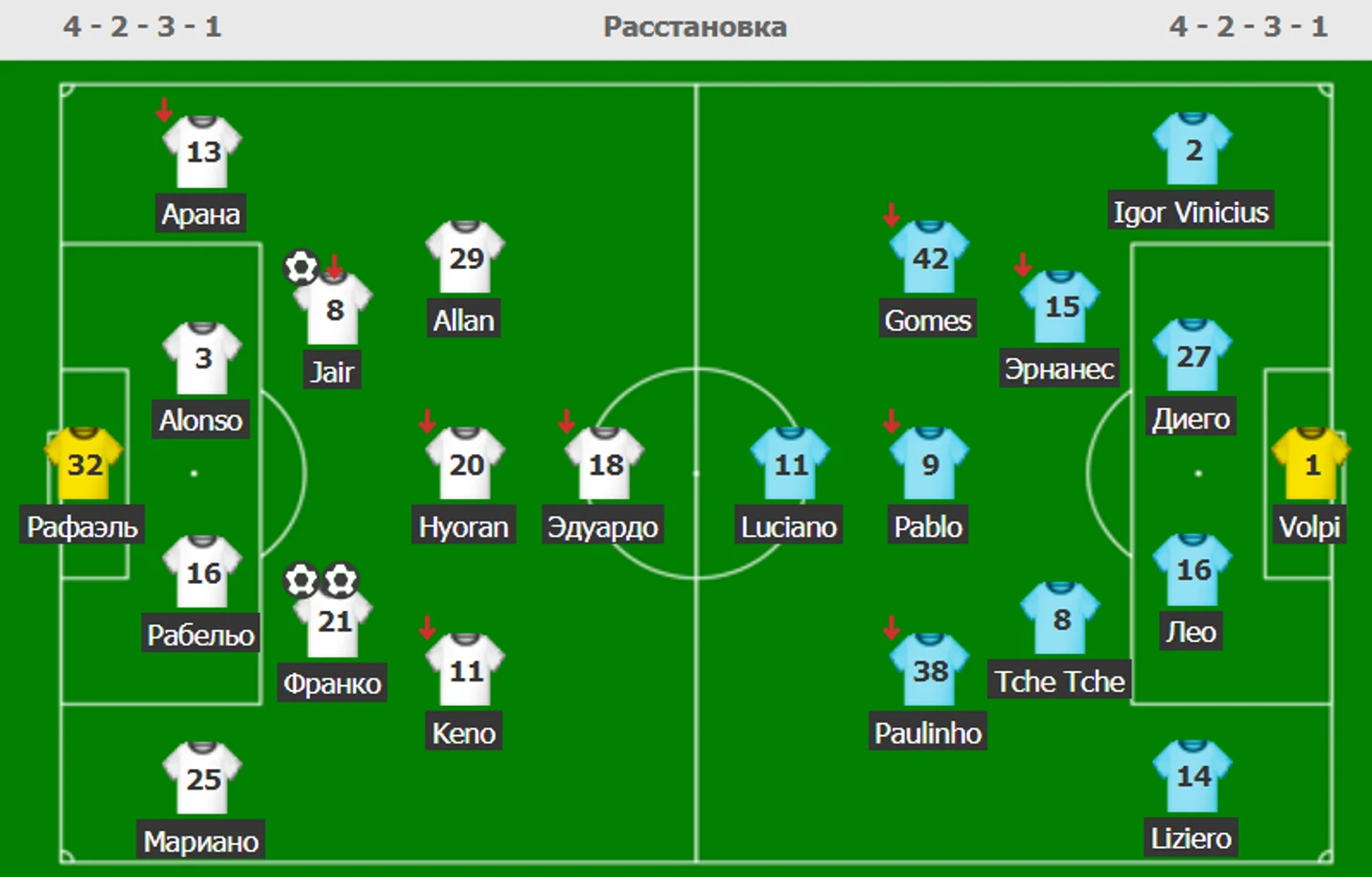 Команда весь матч висела на воротах соперника, пропустив два гола, забитых явно не без везения у соперника. После перерыва вышел вообще сверхатакующий состав, где до этого игравший полузащитника Эвертон стал действовать по всему левому флангу латералем, как весь матч играл латераль справа Орехуэла. Нельзя сказать, что провалили матч и центральные защитники (Жеромел и Каннеман), хоть в атаке они в этом матче и не отметились.