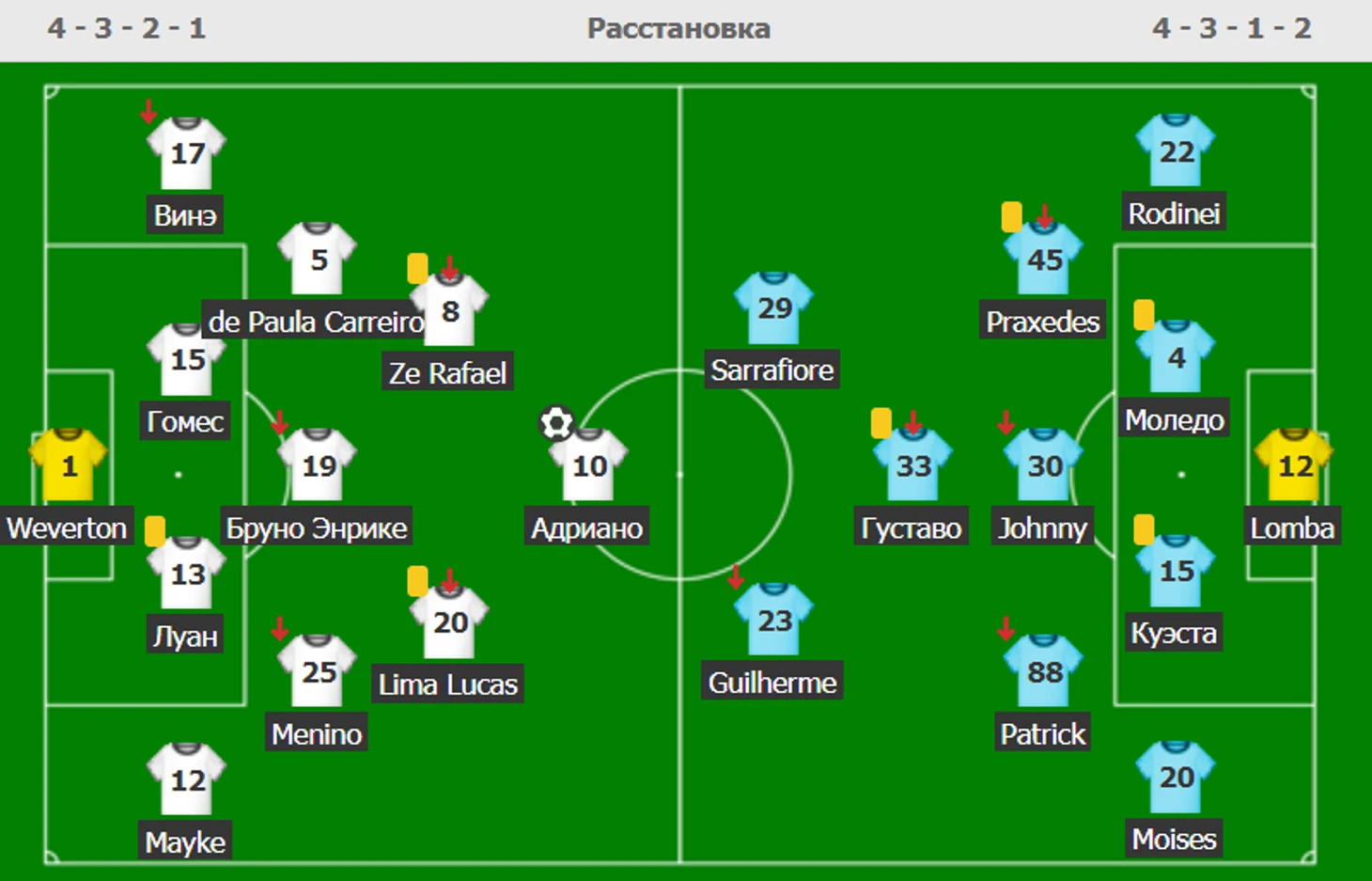 Как и противник, команда провела матч в позиционной борьбе в центре поля. Мяч почти не доходил до форварда Адриано, но игроки атакующей группы, располагающиеся под нападающим Лукас Лима и Зе Рафаэль стали самыми активными участниками борьбы. Вся команда преуспела в разрушении, и конечно же в первую очередь игроки обороны Луан и Гомес. Правый латераль Майке здорово подключался в атаку.