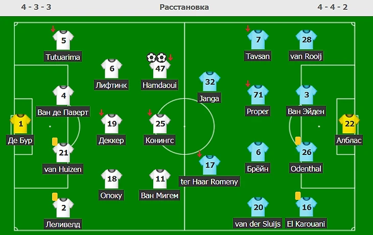 Пыталась оказывать сопротивление, но игру сломало удаление. В Голландии при классических схемах 4-3-3 основной вопрос заключается в последнем пасе и реализации, поскольку команды быстро преодолевают не слишком насыщенный центр поля. Вот и тут у соперника было лучше с последним пасом и реализацией. Хорош был правый защитник Пике до своего удаления. Отмечался плеймейкер Ромменс и центральный полузащитник Дэвид.