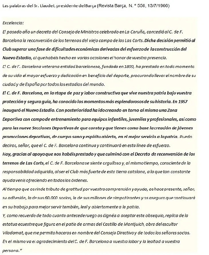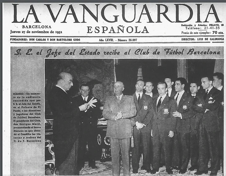 1966 — «Диктатор принимает каталонскую команду. «Барселона» хотела бы поблагодарить Франко за его вмешательство, который спас клуб от банкротства в прошлом году». Это выступление тогдашнего президента «Барсы».