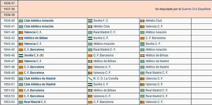 1939 — Окончание войны в Испании. Диктатура Франко правит страной. Первые пять лиг выиграны клубами «Атлетико Авиасьон» (В будущем известный, как «Атлетико Мадрид»), «Валенсией» и «Атлетиком Бильбао».