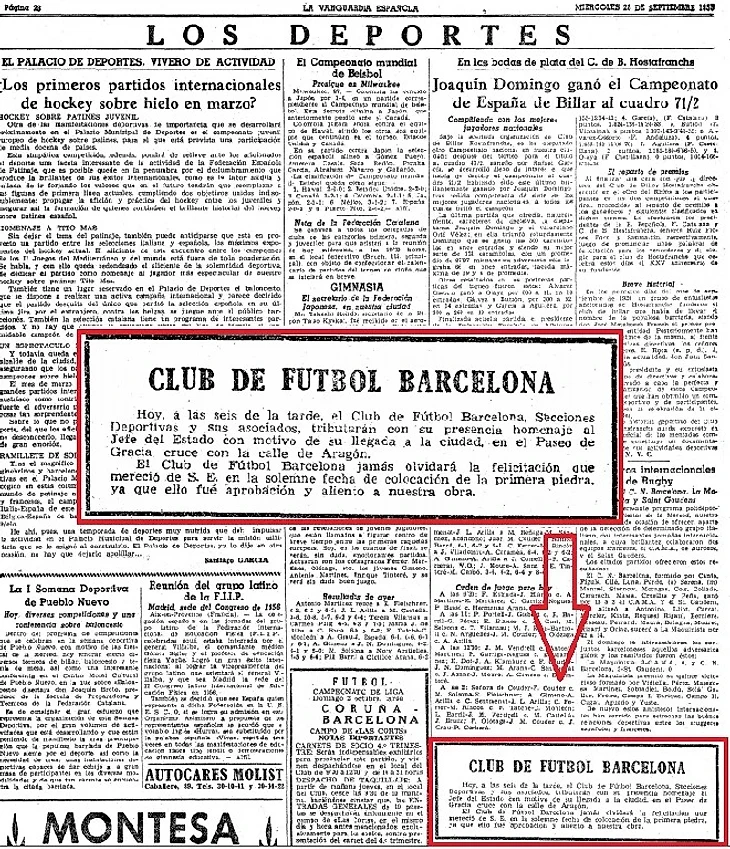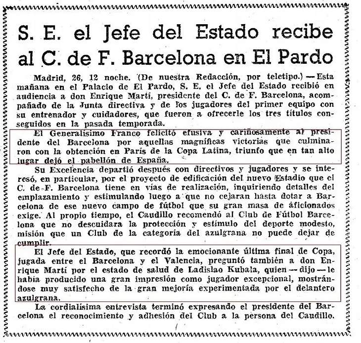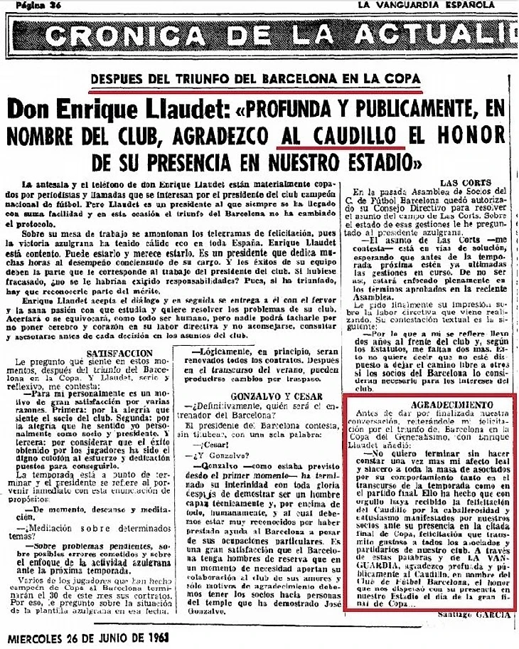 1960 — Новое сообщение от «Барсы» через «La Vanguardia», чтобы члены клуба и болельщики встречали Франко во время его визита в Барселону. Этого, например, не сделали представители «Эспаньола».
