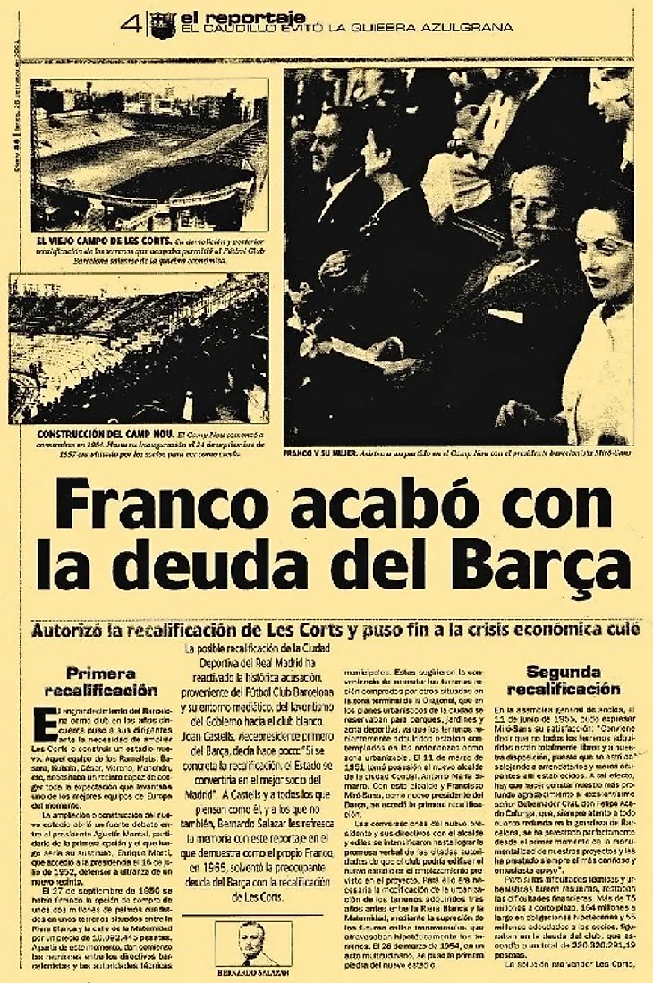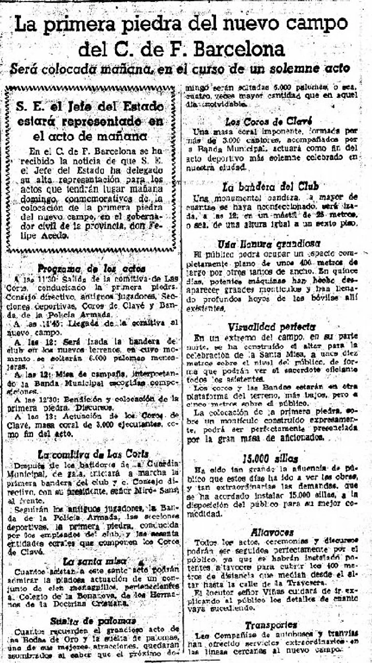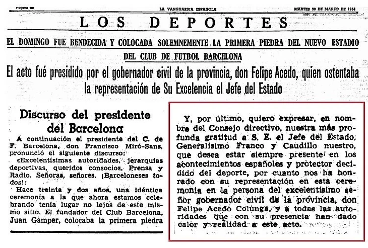 1954 — Закладка первого камня «Камп Ноу». Тогдашний президент «Барсы» получил новую переквалификацию, продав земли и публично поблагодарил Франко. Диктатор был назначен почетным президентом инаугурационной комиссии.