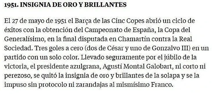 Агусти Монталь Галобарт, тогдашний президент (1946 по 1952) «Барсы», снял свой золотой значок и передал его Франко. Это произошло через несколько минут после того, как «блауграна» завоевала Кубок Генералиссимуса (3:0 против «Реал Сосьедад»).