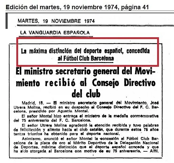 Правительство Франко присваивает «Барсе» высшую награду в испанском спорте.