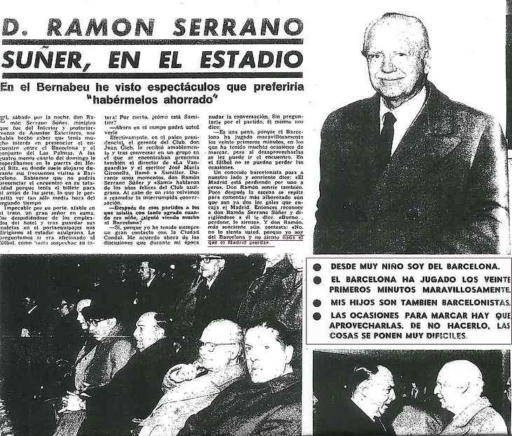 1969 — Рамон Серрано Сунер, зять Франко, был министром в период с 1938 по 1942 год во время диктатуры. Он также был президентом Политического совета Фаланги и одним из главных архитекторов режима. Во время интервью в президентской ложе «Камп Ноу» он заявил: «Я играл в «Барсе» с детства... Я ничего не чувствую, когда «Мадрид» проигрывает».