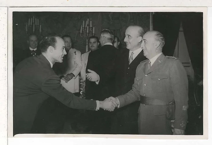 Энрик Марти с диктатором Франсиско Франко приветствуют нападающего «Барсы» Сезара.