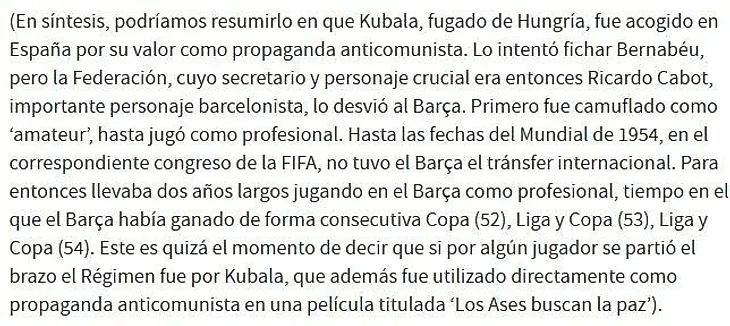 1950 — Кубала, в то время один из лучших игроков Европы, подписывает контракт с «Барселоной». Различные историки объясняют, как режим Франко помог в подписании. Диктатура облегчила оформление документов и национализацию игрока.