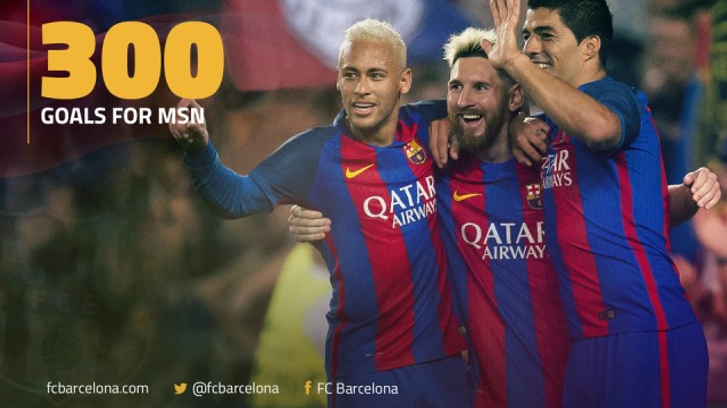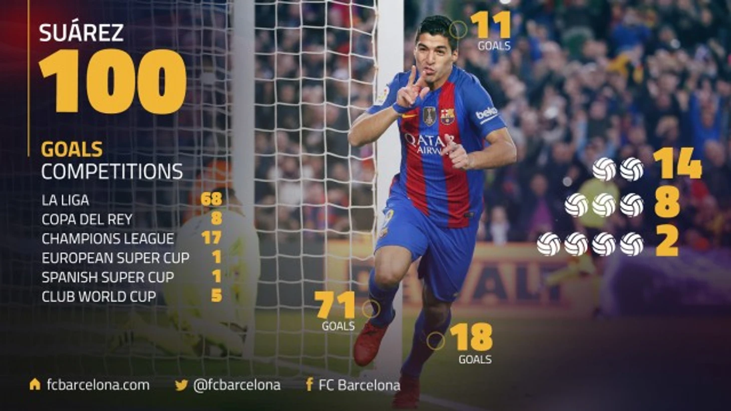 В январе 2017-го на "Камп Ноу" в рамках Кубка Короля Суарес поразил ворота "Атлитика" из Бильбао. Этот гол стал юбилейным по двум показателям: 100-й для Суареса в составе "сине-гранатовых" и 300-й для атакующего трио MSN.