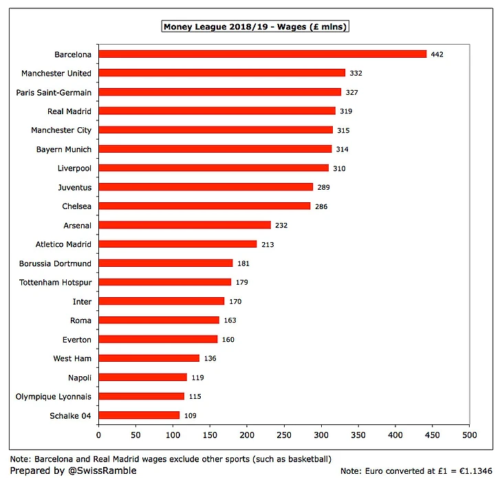 Исключив все виды спорта, которые культивируются «Барселоной», она все равно имеет самый большой фонд заработной платы в 442 млн фунтов, что на 100 млн больше, чем у ближайшего преследователя. В диапазоне 22 млн фунтов существуют шесть клубов: «МЮ» (332), ПСЖ (327), «Реал Мадрид» (319), «Манчестер Сити» (315), «Бавария» (314) и «Ливерпуль» (310). «Ювентус» ежегодно платит своим футболистам 289 млн фунтов за сезон.