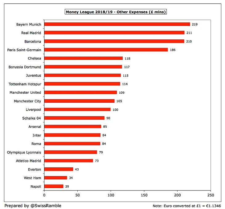 Другие расходы в некоторых клубах очень высокие. Другие расходы — это в том числе транспорт, аренда, техническое обслуживание, коммунальные услуги, страхование, безопасность, услуги консультантов, судебные издержки и другое. Самые высокие показатели у «Баварии» (219 млн фунтов), «Реал Мадрид» (211) и «Барселона» (210). «Ювентус» ежегодно тратит на другие расходы 115 млн фунтов.