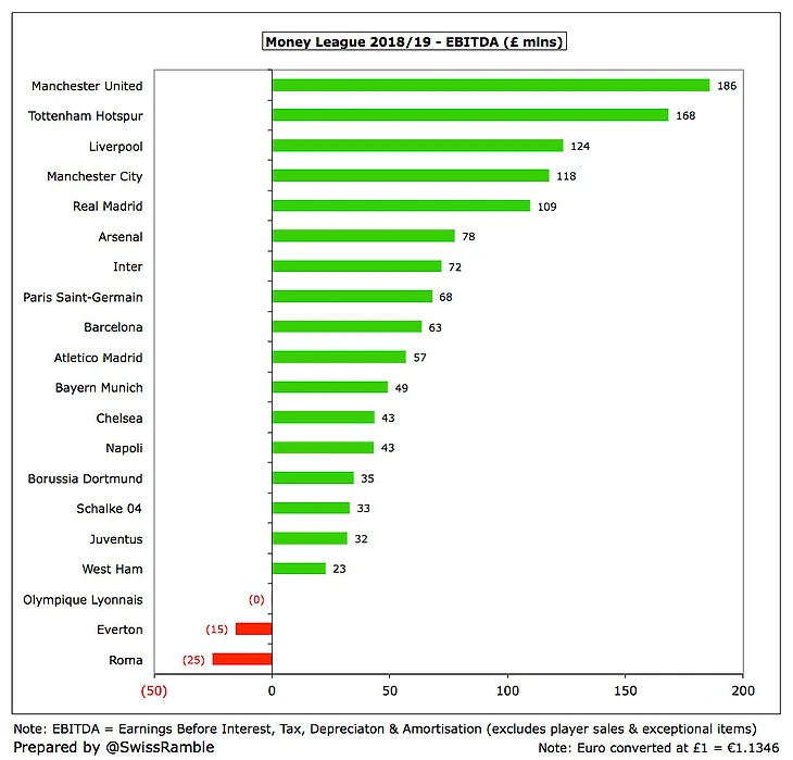 Почти все клубы являются прибыльными с точки зрения EBITDA, причем четыре из самых прибыльных — английские. Это «МЮ» (186 млн), «Тоттенхэм» (168), «Ливерпуль» (124) и «Манчестер Сити» (118). «Ювентус» показал плюс 32 млн фунтов. Единственными клубами, показавшими минус, стали «Рома» (-25 млн) и «Эвертон» (- 15 млн).