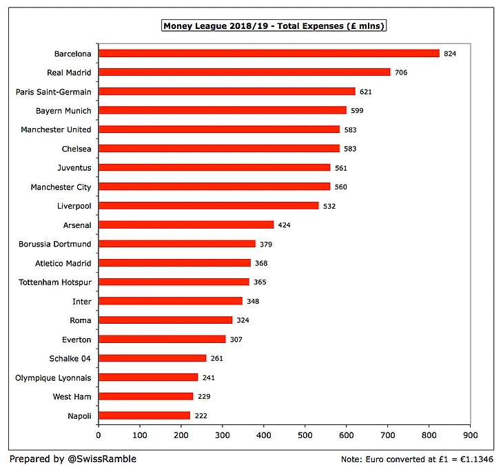 Общие клубные расходы, включающие заработную плату, амортизацию и обесценивание игроков, другую амортизацию и расходы, неуклонно увеличиваются вместе с выручкой. Самый высокий показатель у испанских топ-клубов: «Барселона» — 824 млн фунтов, «Реал Мадрид» — 706 млн. Далее идут ПСЖ (621), «Бавария» (599), «МЮ» (583) и «Челси» (583). У «Ювентуса» седьмое место с клубным расходам в 561 млн фунтов в год.
