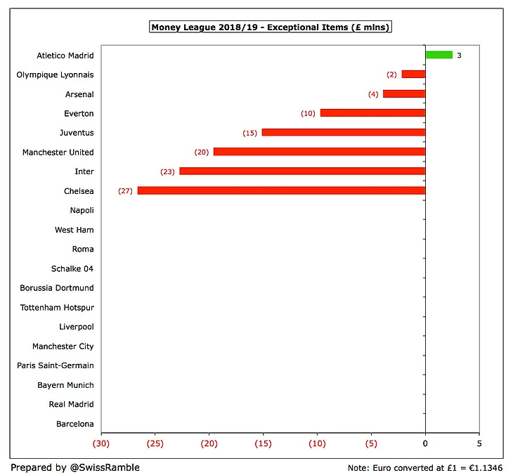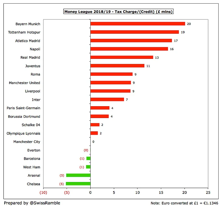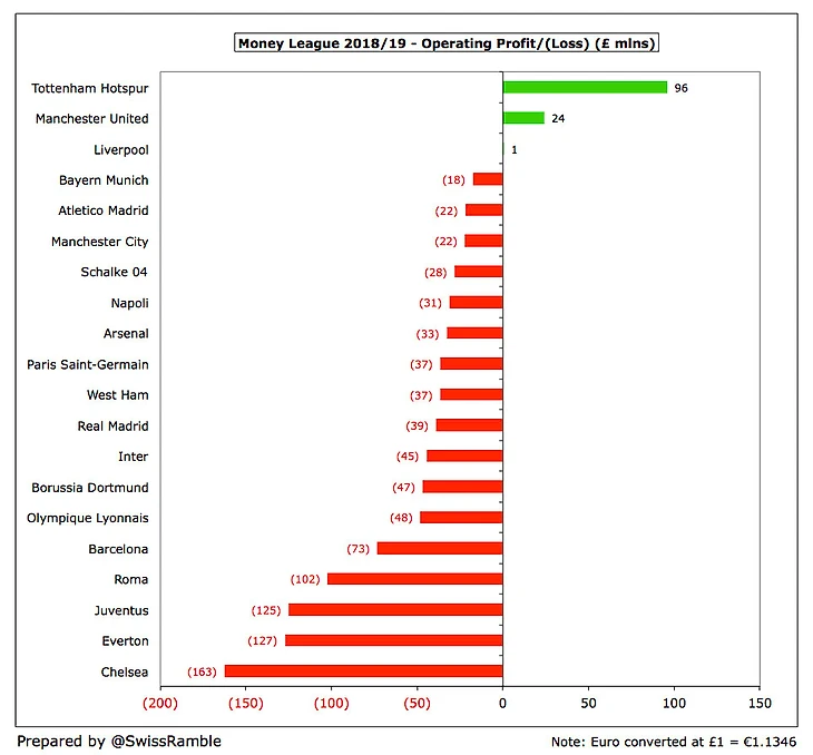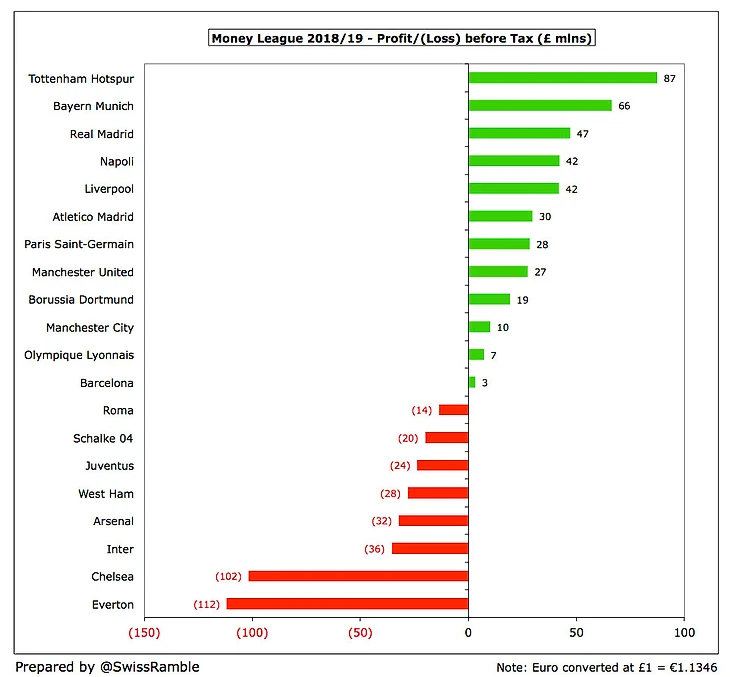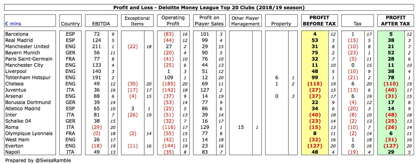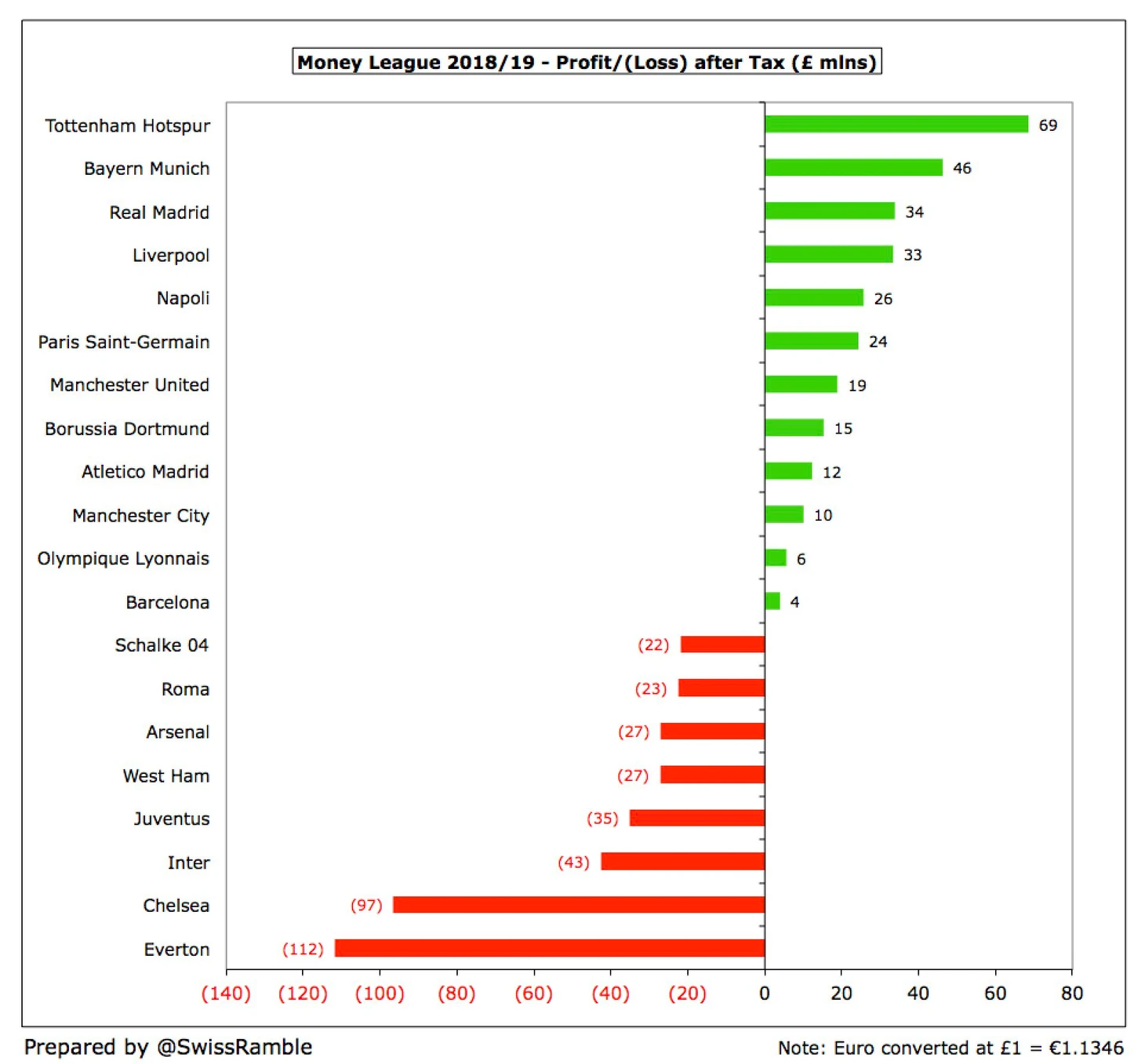 Учтя все моменты, двенадцать клубов показали прибыль после уплаты налогов. Пятерка лучших — «Тоттенхэм» (69 млн), «Бавария» (46), «Реал Мадрид» (34), «Ливерпуль» (33) и «Наполи» (26). Крупнейшие убытки показали «Эвертон» (112), «Челси» (97), «Интер» (43) и «Ювентус» (35).
