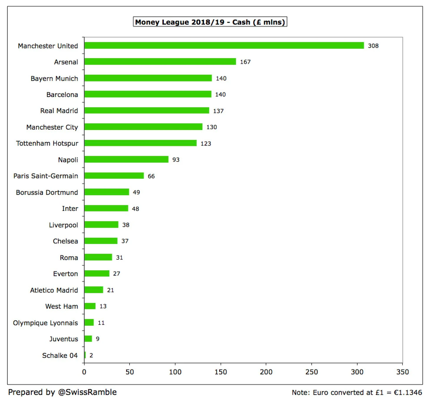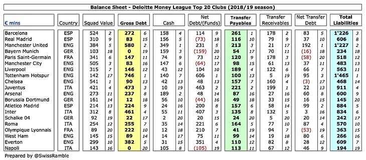 По состоянию на июнь 2019 года, у семи клубов были остатки денежных средств более чем в 100 млн фунтов: «МЮ» (308), «Арсенал» (167), «Бавария» (140), «Барселона» (140), «Реал Мадрид» (137), «Манчестер Сити» (130) и «Тоттенхэм» (123). «Ювентус» имел баланс в 9 млн фунтов. Сейчас они будут намного ниже из-за выплаты долгов и убытков от COVID-19.