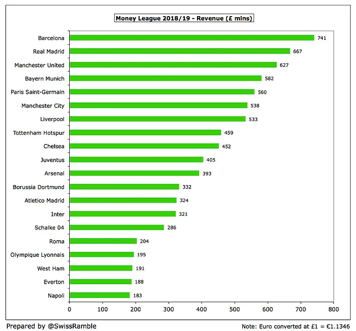 «Барселона» со 741 млн фунтов имеет самый высокий доход. Они опередили своих соперников из мадридского «Реала» (667 млн) и являются первым клубом, который преодолел барьер в 700 млн фунтов. Еще пять клубов преодолели рубеж в 500 млн фунтов: «МЮ» (627), «Бавария» (582), ПСЖ (560), «Манчестер Сити» (538) и «Ливерпуль» (533). У «Ювентуса» десятое место с доходом в 405 млн фунтов.