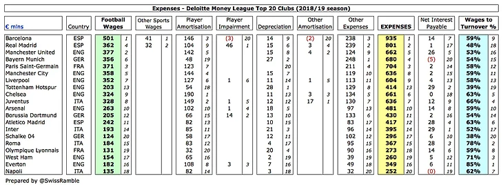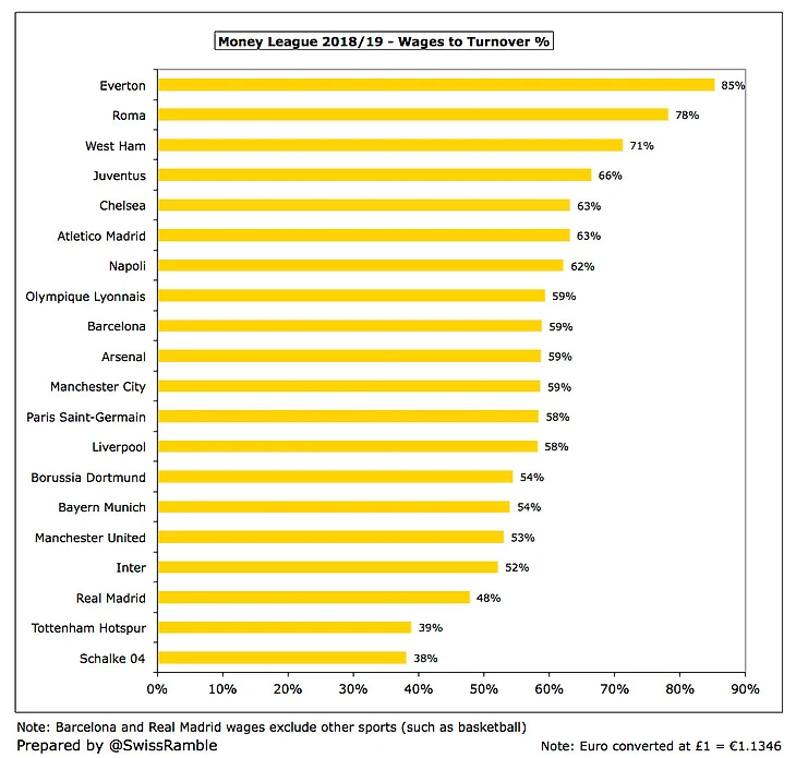В большинстве ведущих клубов Европы соотношение заработной платы к уровню дохода находится в диапазоне 50-60%. Самые высокие, а значит худшие показатели, у «Эвертона» (85%), «Ромы» (78), «Вест Хэма» (71), «Ювентуса» (66), «Челси» (63), «Атлетико» (63) и «Наполи» (62). Самые низкие (лучшие) показатели — это «Шальке 04» (38), «Тоттенхэм» (39) и «Реал Мадрид» (48).