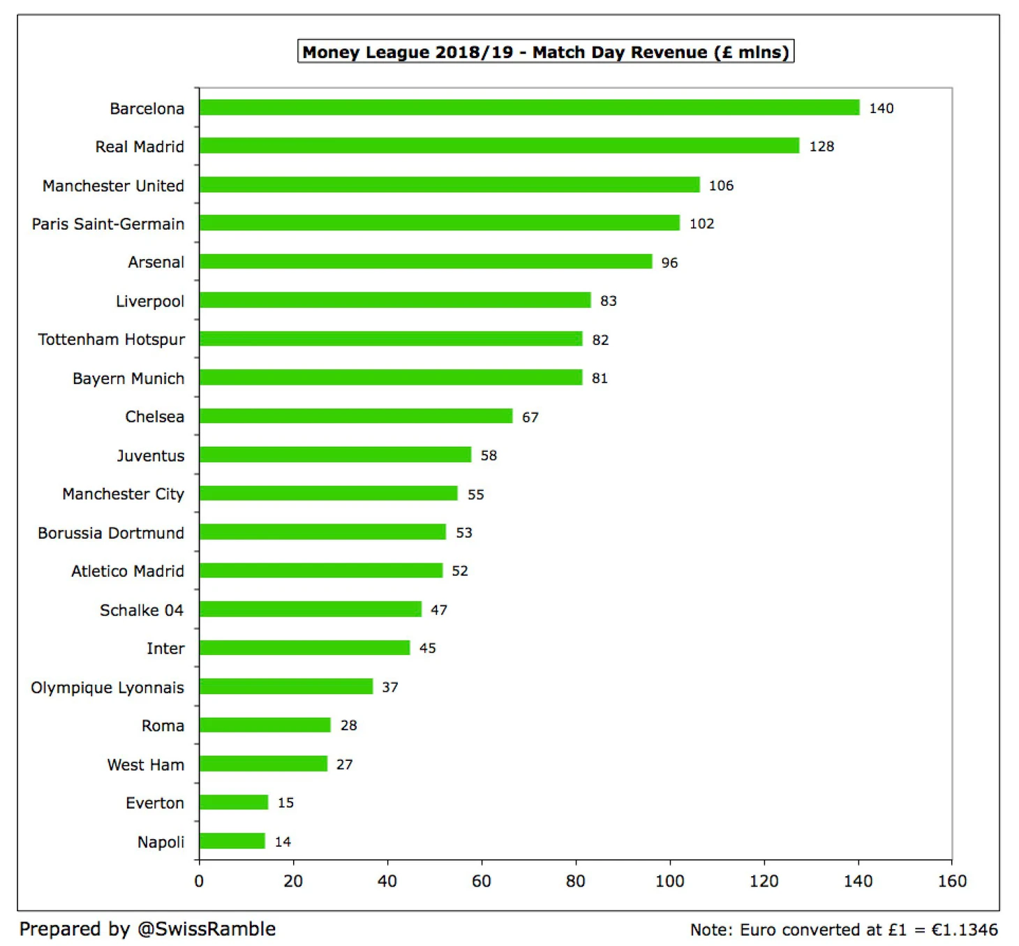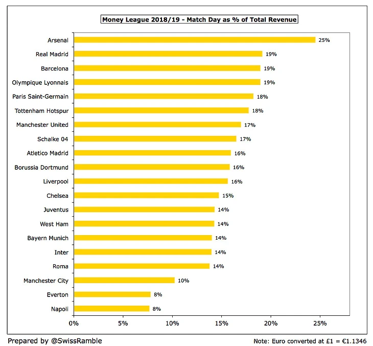 Несмотря на то, что доход от матч-дэя в размере 96 млн фунтов у «Арсенала» поставил их лишь на пятое место того рейтинга, у них самый высокий процент дохода с этого потока — 25%. Это значительно больше, чем у других конкурентов. У «Ювентуса» лишь 14% от общего дохода приходится на матч-дэй.