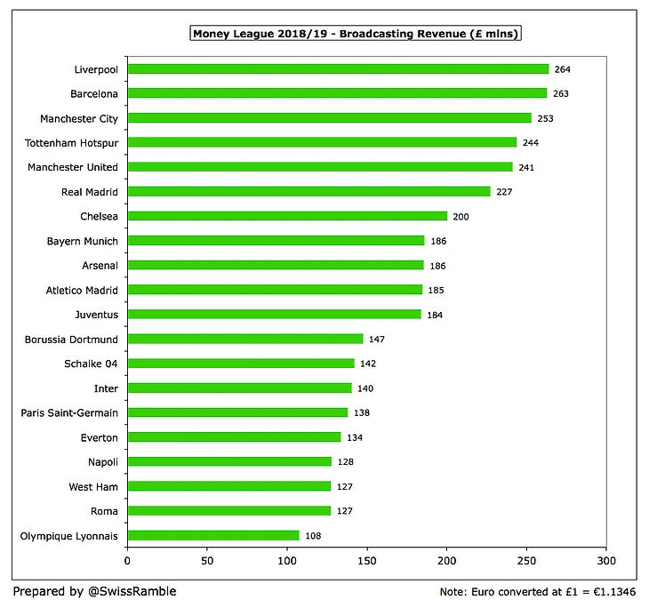 Сразу три клуба заработали более четверти миллиарда фунтов от трансляций. Это «Ливерпуль» (264), «Барселона» (263) и «Манчестер Сити» (253). Далее идут «Тоттенхэм» (244) и «МЮ» (241). У «Ювентуса» доход от трансляций — 184 млн фунтов. На уровне «Баварии», «Арсенала» и мадридского «Атлетико».