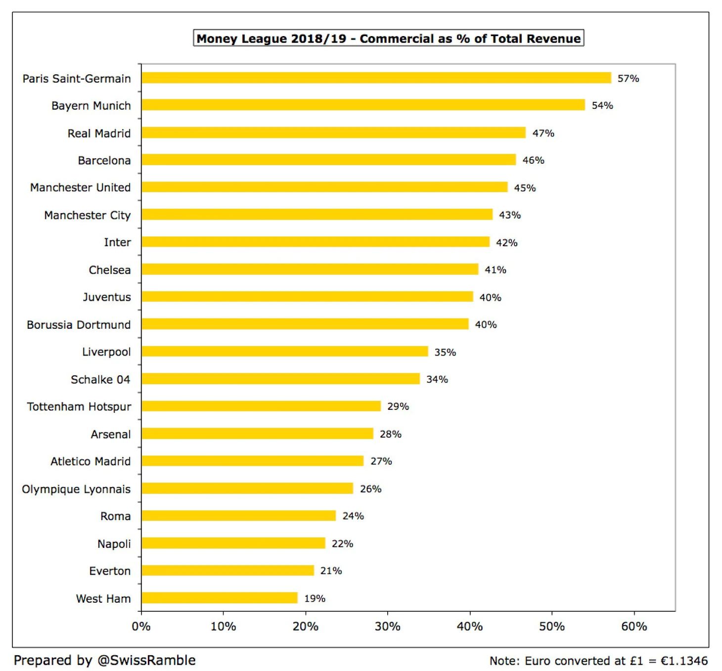 Более половины общего дохода ПСЖ (57%) и «Баварии» (57%) приходится на коммерческий доход. За ними следуют «Реал Мадрид» (47), «Барселона» (46) и «МЮ» (45). «Ювентус» посередине с 40% коммерческого дохода от общего. Этот поток доходов все чаще становится отличительным фактором элитности клубов.